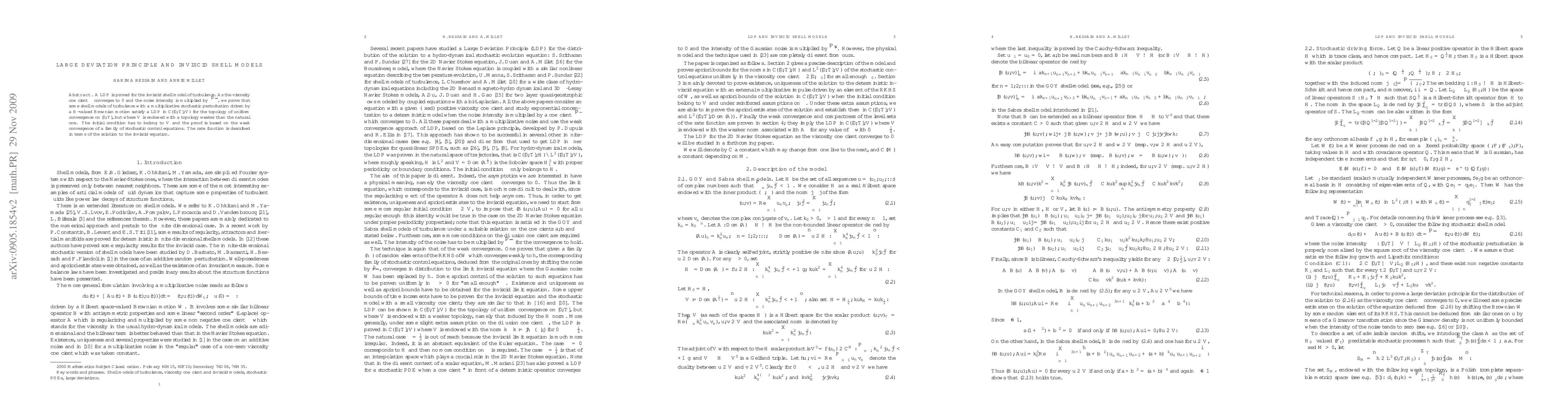A LDP is proved for the inviscid shell model of turbulence. As the viscosity coefficient converges to 0 and the noise intensity is multiplied by the square root of the viscosity, we prove that some shell models of turbulence with a multiplicative stochastic perturbation driven by a H-valued Brownian motion satisfy a LDP in C([0,T],V) for the topology of uniform convergence on [0,T], but where V is endowed with a topology weaker than the natural one. The initial condition has to belong to V and the proof is based on the weak convergence of a family of stochastic control equations. The rate function is described in terms of the solution to the inviscid equation.