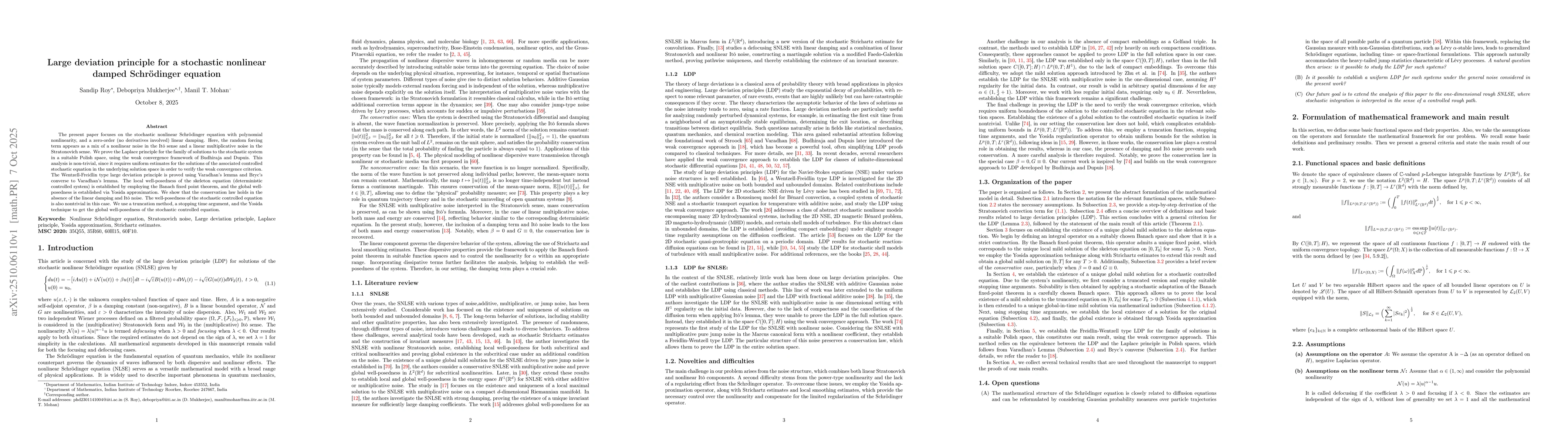 The present paper focuses on the stochastic nonlinear Schrodinger equation with polynomial nonlinearity, and a zero-order (no derivatives involved) linear damping. Here, the random forcing term appears as a mix of a nonlinear noise in the Ito sense and a linear multiplicative noise in the Stratonovich sense. We prove the Laplace principle for the family of solutions to the stochastic system in a suitable Polish space, using the weak convergence framework of Budhiraja and Dupuis. This analysis is nontrivial, since it requires uniform estimates for the solutions of the associated controlled stochastic equation in the underlying solution space in order to verify the weak convergence criterion. The Wentzell Freidlin type large deviation principle is proved using Varadhan's lemma and Bryc's converse to Varadhan's lemma. The local well-posedness of the skeleton equation (deterministic controlled system) is established by employing the Banach fixed point theorem, and the global well posedness is established via Yosida approximation. We show that the conservation law holds in the absence of the linear damping and Ito noise. The well posedness of the stochastic controlled equation is also nontrivial in this case. We use a truncation method, a stopping time argument, and the Yosida technique to get the global well-posedness of the stochastic controlled equation.