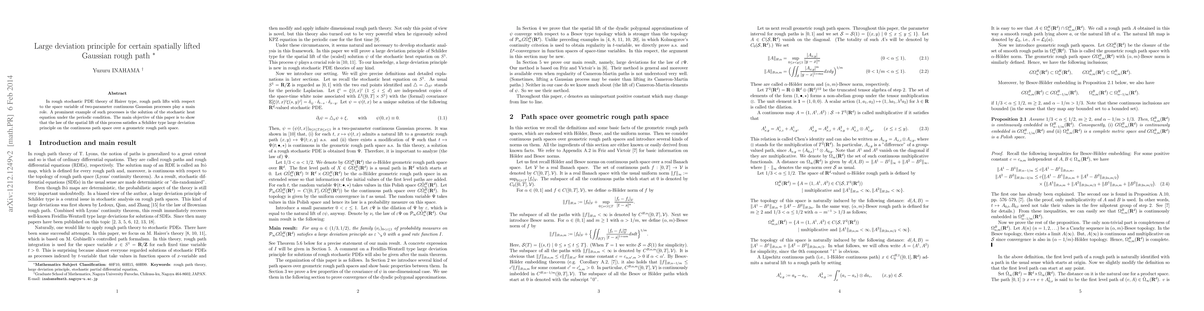 In rough stochastic PDE theory of Hairer type, rough path lifts with respect to the space variable of two-parameter continuous Gaussian processes play a main role. A prominent example of such processes is the solution of the stochastic heat equation under the periodic condition. The main objective of this paper is to show that the law of the spatial lift of this process satisfies a Schilder type large deviation principle on the continuous path space over a geometric rough path space.