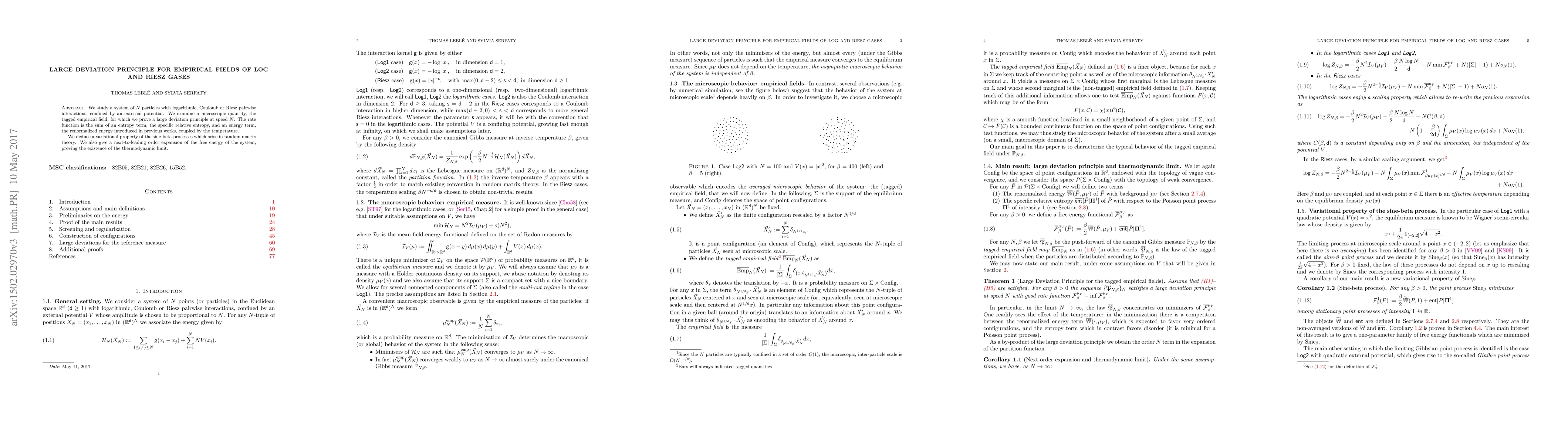This paper proves a large deviation principle for the empirical field in systems of N particles with logarithmic or Riesz interactions, establishing a rate function combining entropy and renormalized energy terms. It also explores the variational properties of sine-beta processes and provides a next-to-leading order expansion for the system's free energy, confirming the existence of a thermodynamic limit.