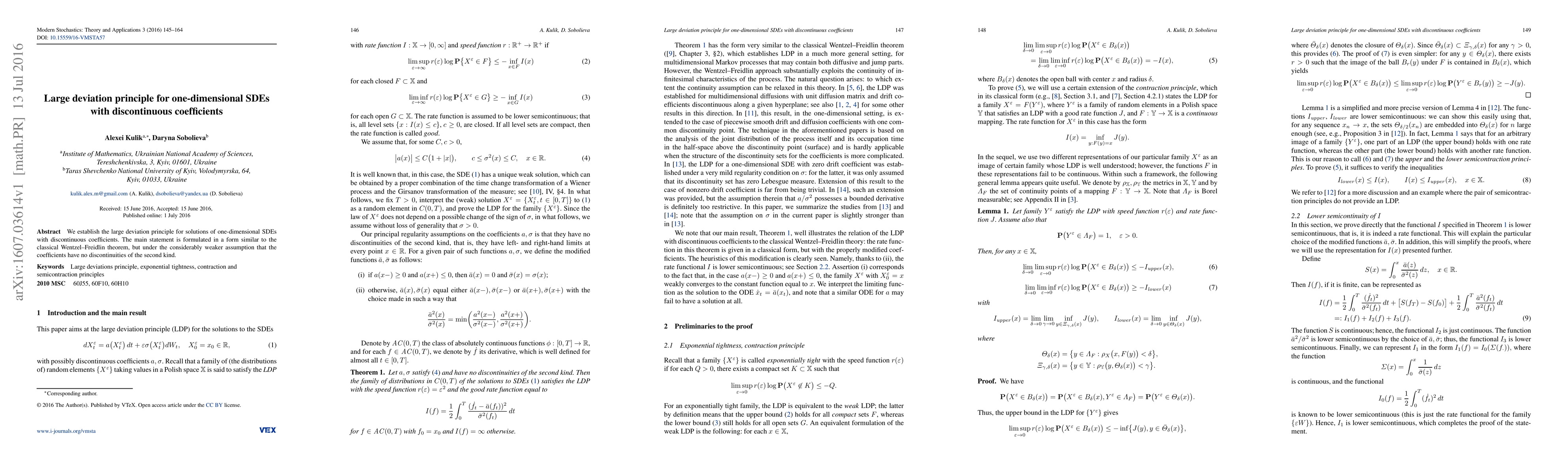 Summary: This paper establishes the large deviation principle for one-dimensional stochastic differential equations (SDEs) with discontinuous coefficients, extending the classical Wentzel-Freidlin theorem under the condition that the coefficients do not have discontinuities of the second kind.
