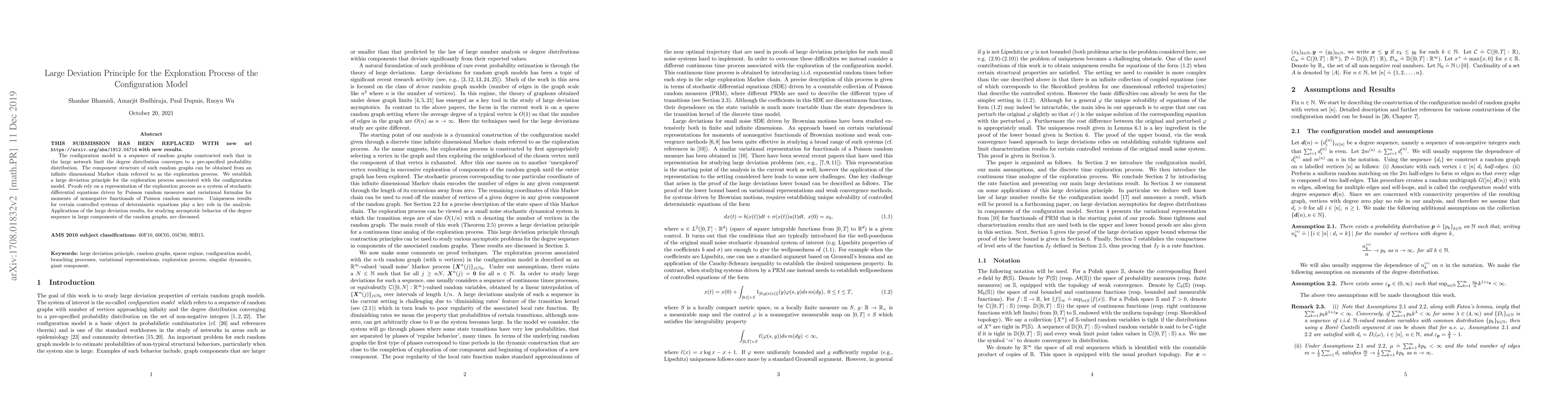 This paper establishes a large deviation principle for the exploration process of the configuration model, representing it as a system of stochastic differential equations driven by Poisson random measures. The results are applied to study the asymptotic behavior of degree sequences in large components of random graphs.