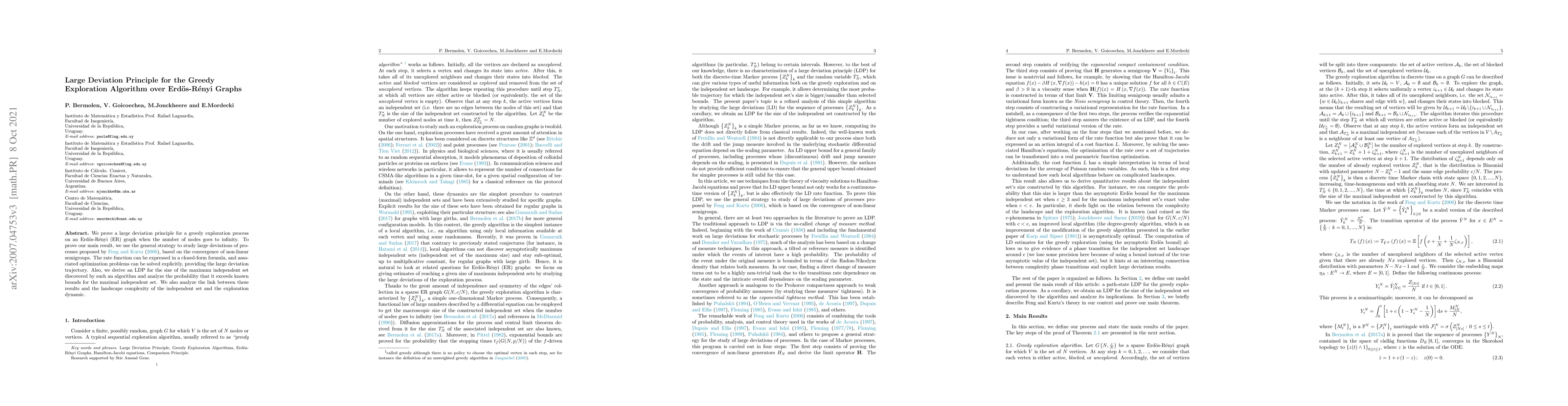 This paper establishes a large deviation principle for a greedy exploration algorithm on Erdős-Rényi graphs as the number of nodes grows. It employs a method by Feng and Kurtz to derive a closed-form rate function and explicitly solve associated optimization problems, also analyzing the size of the maximum independent set discovered by the algorithm.