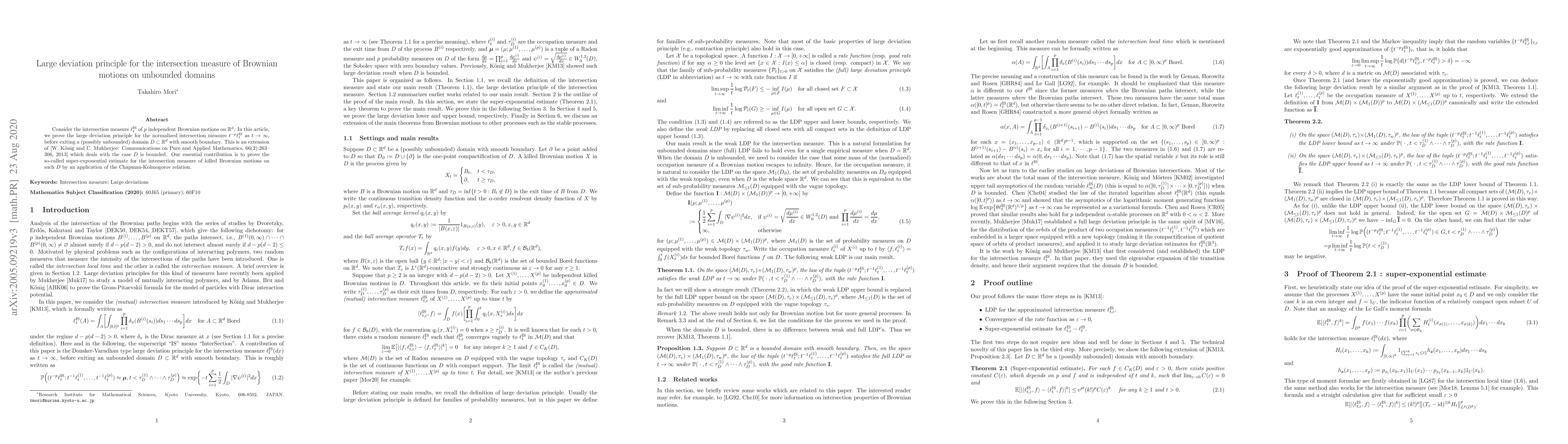 Consider the intersection measure $\ell^{\mathrm{IS}}_t$ of $p$ independent Brownian motions on $\mathbb{R}^d$. In this article, we prove the large deviation principle for the normalized intersection measure $t^{-p}\ell^{\mathrm{IS}}_t$ as $t\rightarrow \infty$, before exiting a (possibly unbounded) domain $D\subset\mathbb{R}^d$ with smooth boundary. This is an extension of [W. K\"onig and C. Mukherjee: Communications on Pure and Applied Mathematics, 66(2):263--306, 2013] which deals with the case $D$ is bounded. Our essential contribution is to prove the so-called super-exponential estimate for the intersection measure of killed Brownian motions on such $D$ by an application of the Chapman-Kolmogorov relation.