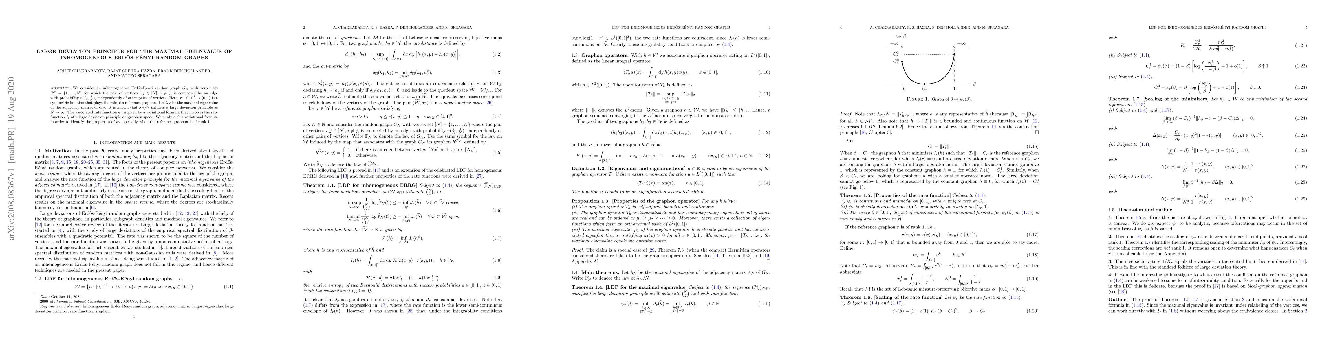 This paper investigates the large deviation principle for the maximal eigenvalue of inhomogeneous Erdős-Rényi random graphs, where the edge probability between vertices depends on a symmetric graphon function. It analyzes the associated rate function, particularly focusing on the case when the reference graphon is of rank 1.