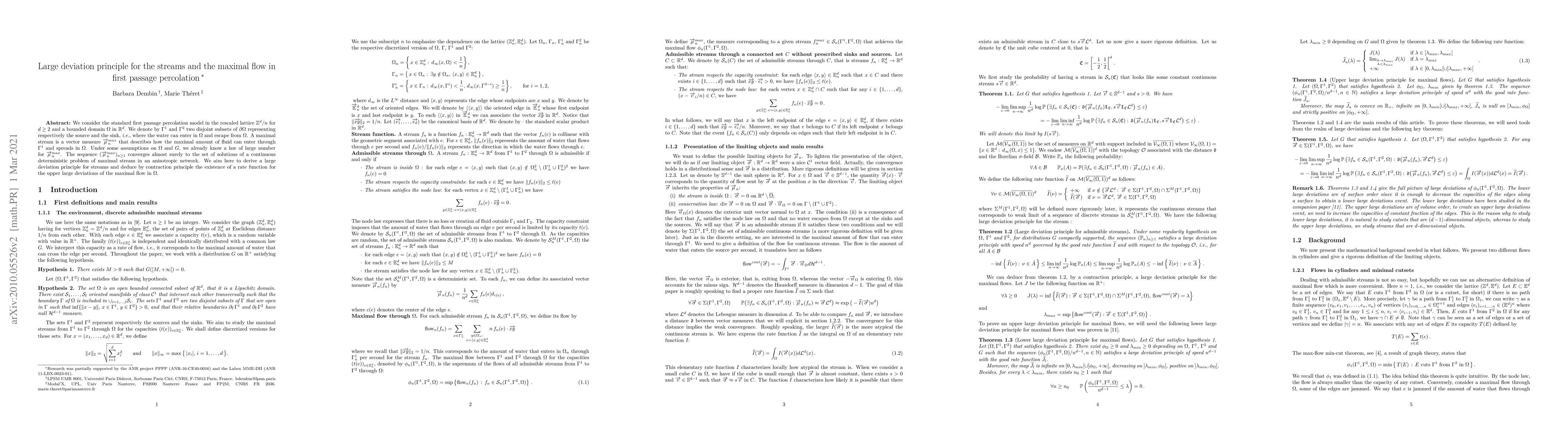 We consider the standard first passage percolation model in the rescaled lattice $\mathbb{Z}^d$ for $d\geq 2$ and a bounded domain $\Omega$ in $\mathbb R ^d$. We denote by $\Gamma^1$ and $\Gamma^2$ two disjoint subsets of $\partial \Omega$ representing respectively the source and the sink, i.e., where the water can enter in $\Omega$ and escape from $\Omega$. A maximal stream is a vector measure $\overrightarrow{\mu}_n^{max}$ that describes how the maximal amount of fluid can enter through $\Gamma^1$ and spreads in $\Omega$. Under some assumptions on $\Omega$ and $G$, we already know a law of large number for $\overrightarrow{\mu}_n^{max}$. The sequence $(\overrightarrow{\mu}_n^{max})_{n\geq 1} $ converges almost surely to the set of solutions of a continuous deterministic problem of maximal stream in an anisotropic network. We aim here to derive a large deviation principle for streams and deduce by contraction principle the existence of a rate function for the upper large deviations of the maximal flow in $\Omega$.