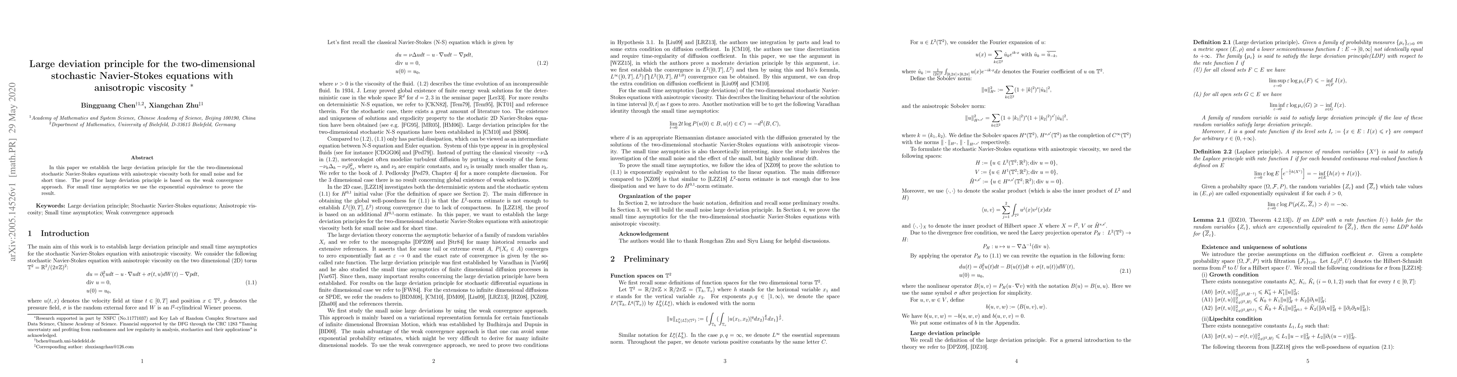 This paper establishes the large deviation principle for two-dimensional stochastic Navier-Stokes equations with anisotropic viscosity under small noise conditions, using a weak convergence approach and exponential equivalence for short time asymptotics.