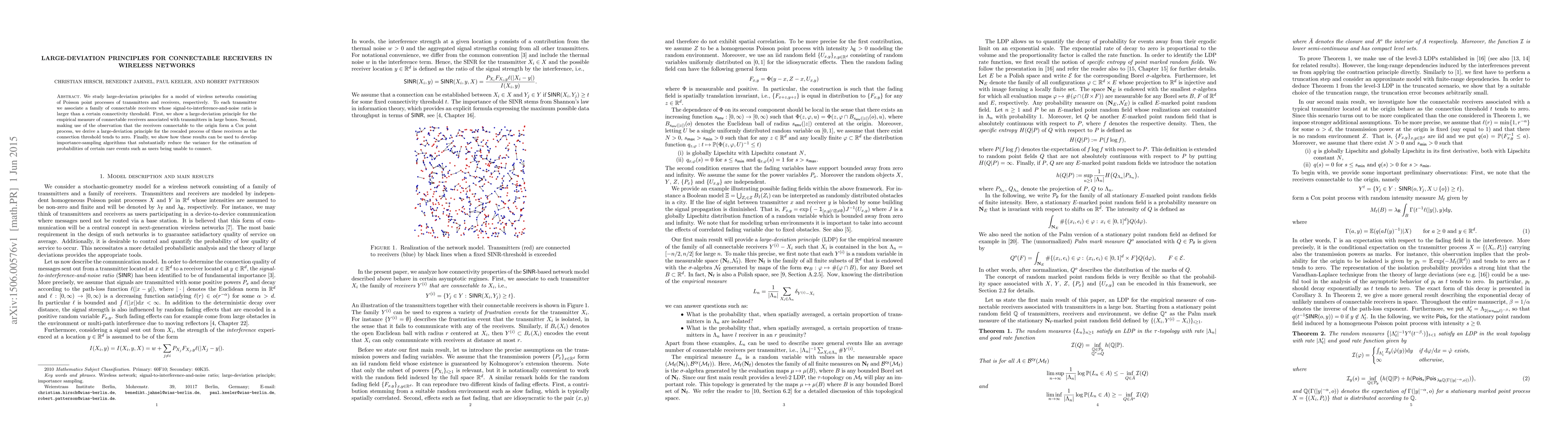 This paper develops large-deviation principles for a model of wireless networks with connectable receivers, enabling more accurate estimation of rare events and reduced variance in importance-sampling algorithms.