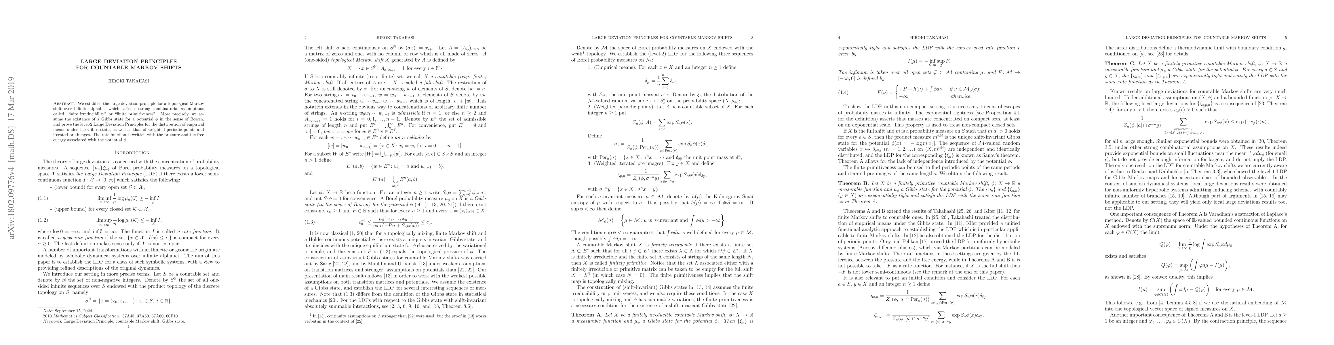 The research establishes large deviation principles for countable Markov shifts over an infinite alphabet, assuming finite irreducibility or primitiveness and the existence of a Gibbs state for a potential φ. It proves level-2 large deviation principles for the distribution of empirical means under the Gibbs state, as well as for weighted periodic points and iterated pre-images.