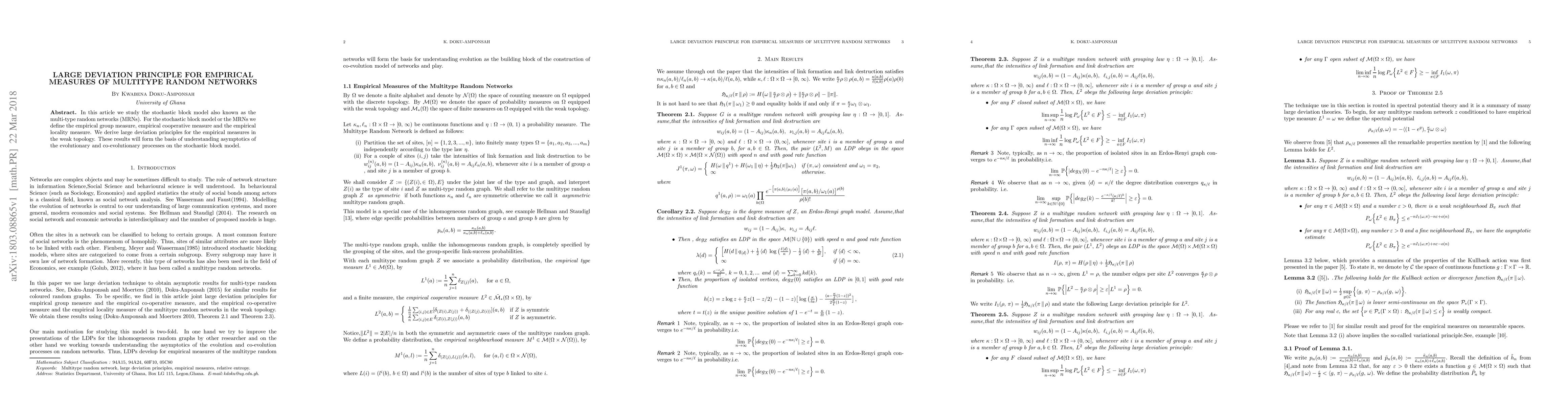 In this article we study the stochastic block model also known as the multi-type random networks (MRNs). For the stochastic block model or the MRNs we define the empirical group measure, empirical cooperative measure and the empirical locality measure. We derive large deviation principles for the empirical measures in the weak topology. These results will form the basis of understanding asymptotics of the evolutionary and co-evolutionary processes on the stochastic block model.