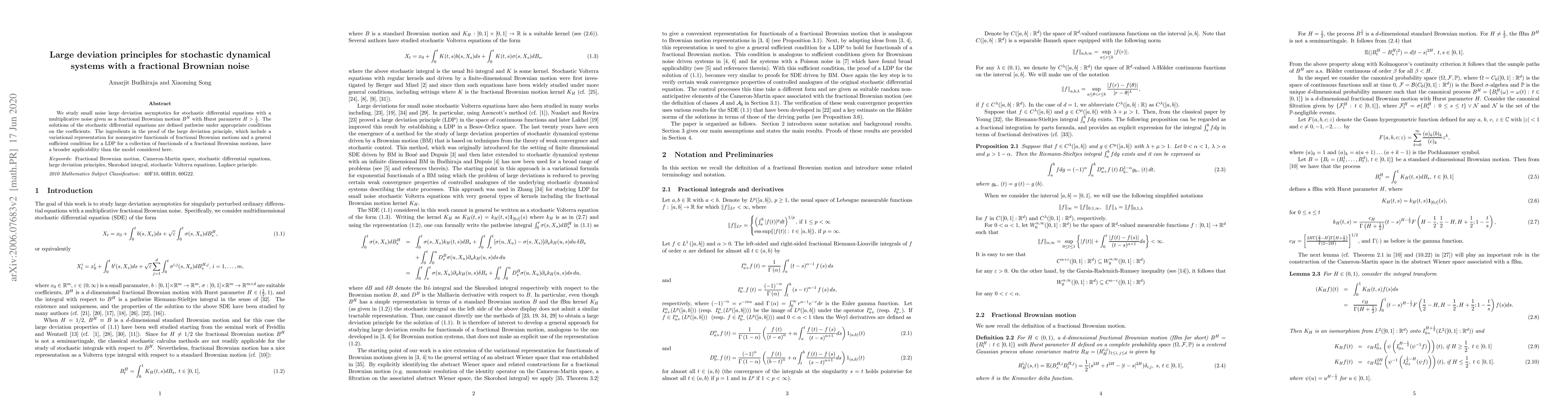 We study small noise large deviation asymptotics for stochastic differential equations with a multiplicative noise given as a fractional Brownian motion $B^H$ with Hurst parameter $H>\frac12$. The solutions of the stochastic differential equations are defined pathwise under appropriate conditions on the coefficients. The ingredients in the proof of the large deviation principle, which include a variational representation for nonnegative functionals of fractional Brownian motions and a general sufficient condition for a LDP for a collection of functionals of a fractional Brownian motions, have a broader applicability than the model considered here.