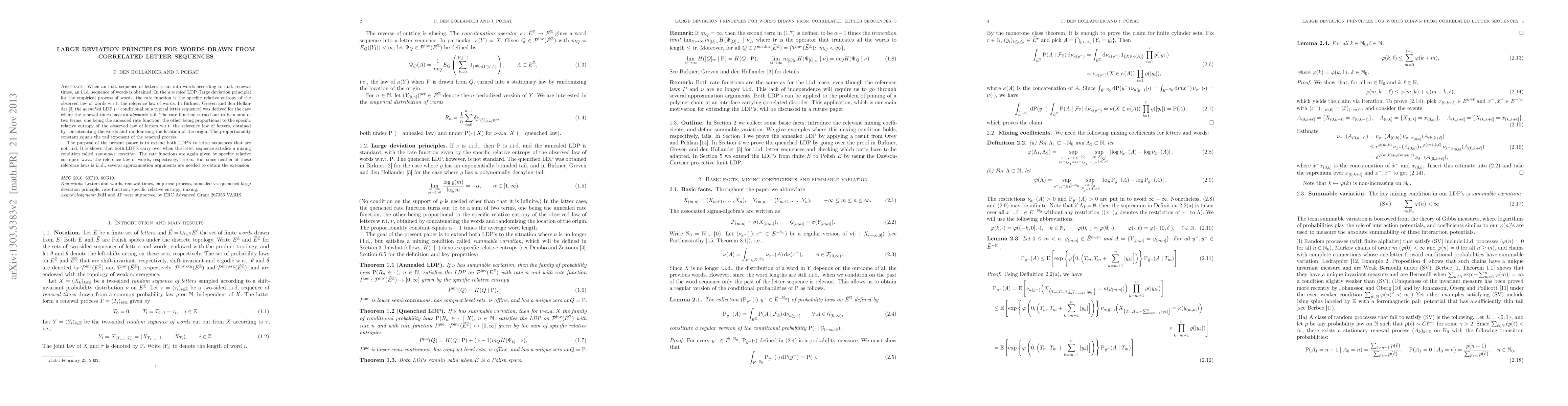 When an i.i.d.\ sequence of letters is cut into words according to i.i.d.\ renewal times, an i.i.d.\ sequence of words is obtained. In the \emph{annealed} LDP (large deviation principle) for the empirical process of words, the rate function is the specific relative entropy of the observed law of words w.r.t.\ the reference law of words. In Birkner, Greven and den Hollander \cite{BGdH10} the \emph{quenched} LDP (= conditional on a typical letter sequence) was derived for the case where the renewal times have an \emph{algebraic} tail. The rate function turned out to be a sum of two terms, one being the annealed rate function, the other being proportional to the specific relative entropy of the observed law of letters w.r.t.\ the reference law of letters, obtained by concatenating the words and randomising the location of the origin. The proportionality constant equals the tail exponent of the renewal process. The purpose of the present paper is to extend both LDP's to letter sequences that are not i.i.d. It is shown that both LDP's carry over when the letter sequence satisfies a mixing condition called \emph{summable variation}. The rate functions are again given by specific relative entropies w.r.t.\ the reference law of words, respectively, letters. But since neither of these reference laws is i.i.d., several approximation arguments are needed to obtain the extension.