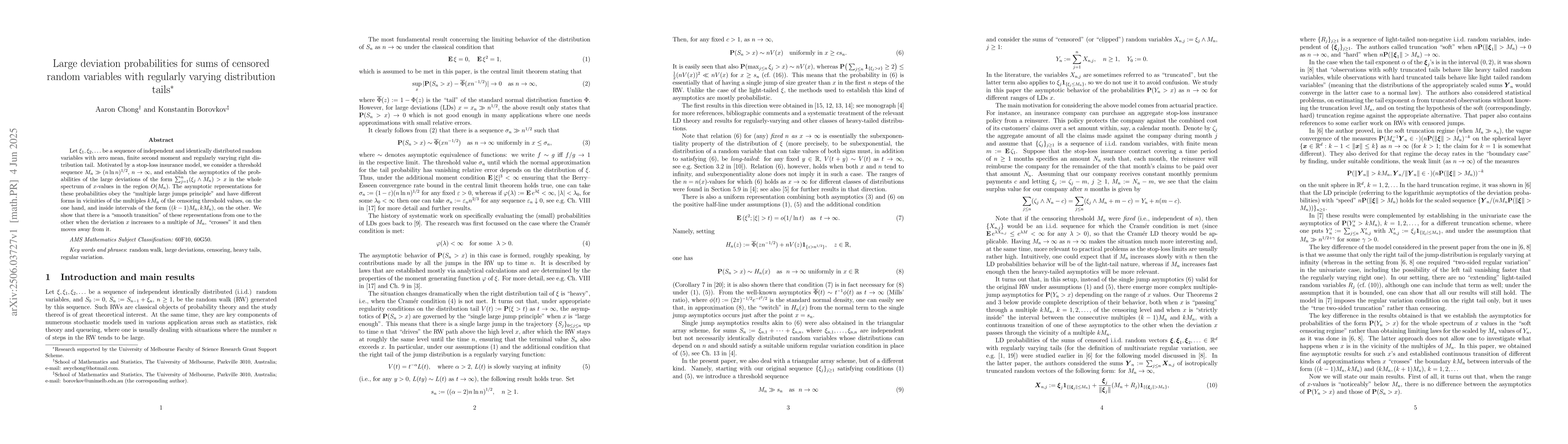 This paper studies the large deviation probabilities of sums of censored random variables with regularly varying distribution tails, finding a