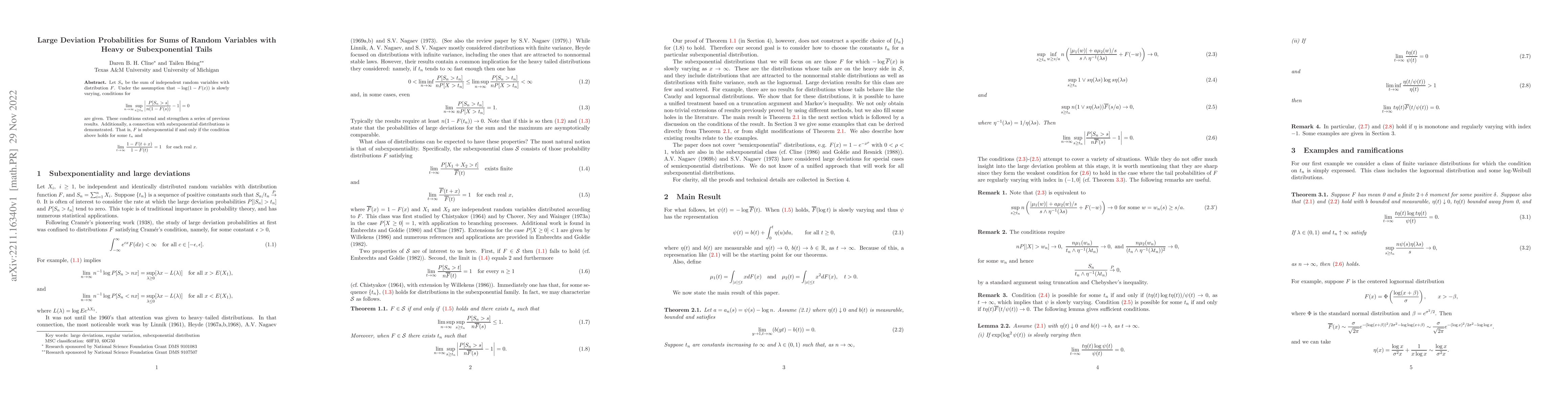 This paper provides conditions for large deviation probabilities for sums of independent random variables with heavy or subexponential tails, extending previous results. It establishes a connection between these conditions and subexponential distributions, showing that a distribution is subexponential if certain large deviation limits hold true.