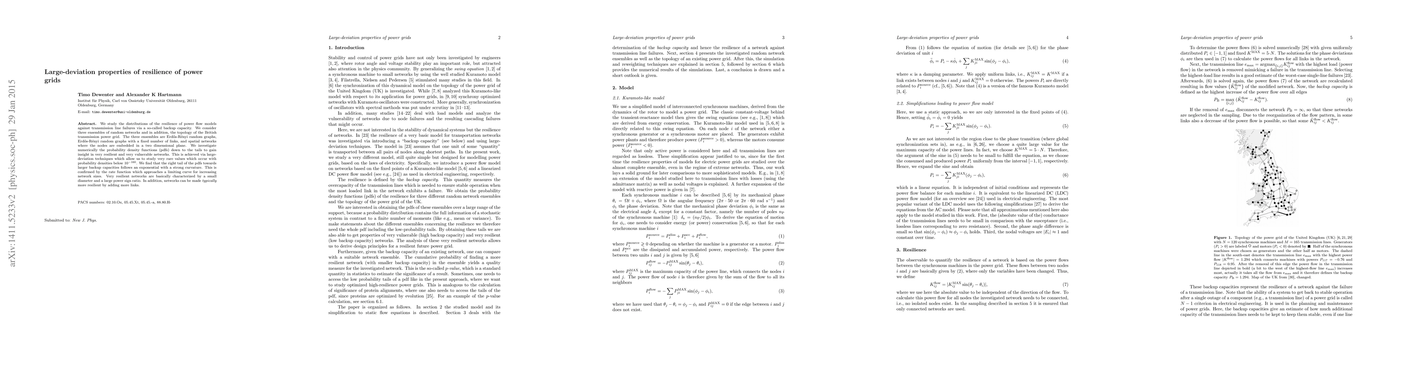 We study the distributions of the resilience of power flow models against transmission line failures via a so-called backup capacity. We consider three ensembles of random networks and in addition, the topology of the British transmission power grid. The three ensembles are Erd\H{o}s-R\'enyi random graphs, Erd\H{o}s-R\'enyi random graphs with a fixed number of links, and spatial networks where the nodes are embedded in a two dimensional plane. We investigate numerically the probability density functions (pdfs) down to the tails to gain insight in very resilient and very vulnerable networks. This is achieved via large-deviation techniques which allow us to study very rare values which occur with probability densities below $10^{-160}$. We find that the right tail of the pdfs towards larger backup capacities follows an exponential with a strong curvature. This is confirmed by the rate function which approaches a limiting curve for increasing network sizes. Very resilient networks are basically characterized by a small diameter and a large power sign ratio. In addition, networks can be made typically more resilient by adding more links.
