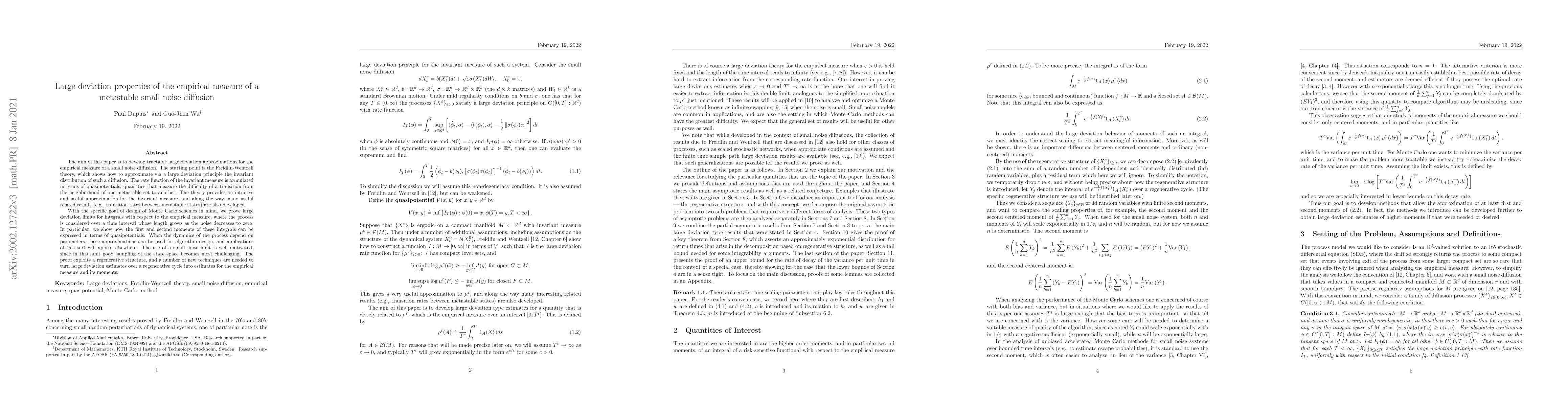 This paper develops large deviation approximations for the empirical measure of a small noise diffusion using Freidlin-Wentzell theory, focusing on quasipotentials to describe transition difficulties between metastable states. It also proves large deviation limits for integrals with respect to the empirical measure, showing how moments can be expressed in terms of these quasipotentials, with applications to Monte Carlo scheme design.