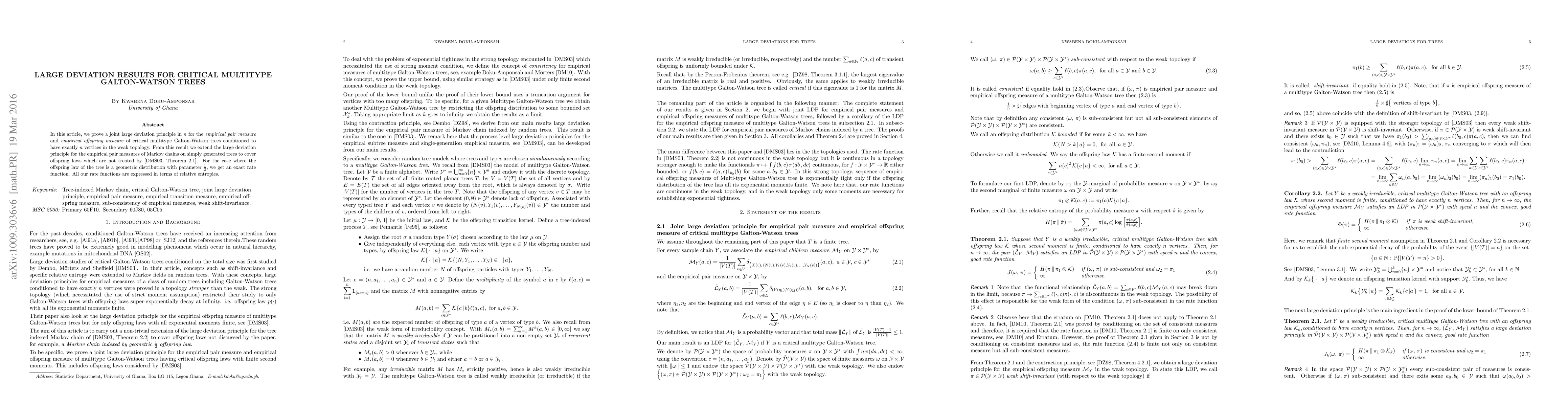 In this article, we prove a joint large deviation principle in $n$ for the \emph{empirical pair measure} and \emph{ empirical offspring measure} of critical multitype Galton-Watson trees conditioned to have exactly $n$ vertices in the weak topology. From this result we extend the large deviation principle for the empirical pair measures of Markov chains on simply generated trees to cover offspring laws which are not treated by \cite[Theorem~2.1]{DMS03}. For the case where the offspring law of the tree is a geometric distribution with parameter \sfrac{1}{2}, we get an exact rate function. All our rate functions are expressed in terms of relative entropies.