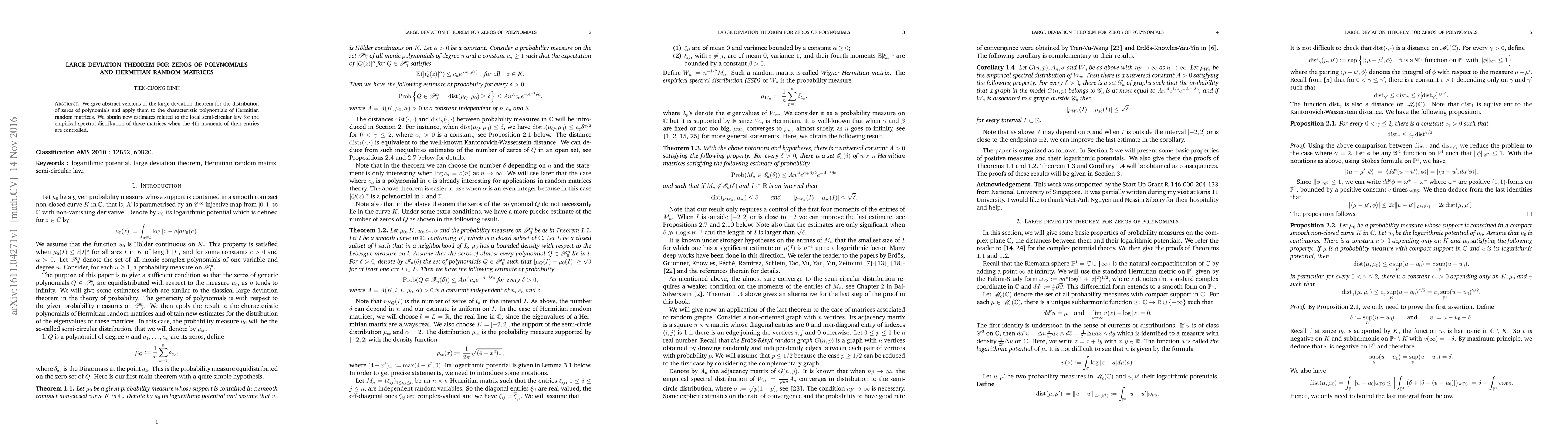 Summary: This paper presents abstract large deviation theorems for the zeros of polynomials and applies them to Hermitian random matrices, yielding new estimates for the local semi-circular law under controlled 4th moments of matrix entries.