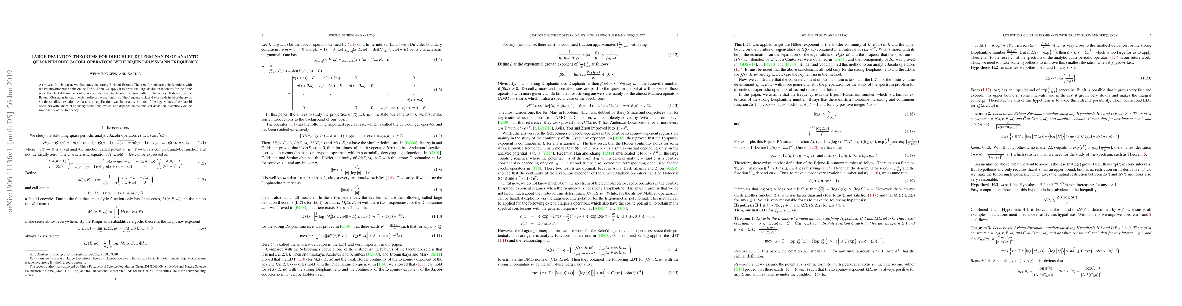 In this paper, we first study the strong Birkhoff Ergodic Theorem for subharmonic functions with the Brjuno-R\"ussmann shift on the Torus. Then, we apply it to prove the large deviation theorems for the finite scale Dirichlet determinants of quasi-periodic analytic Jacobi operators with this frequency. It shows that the Brjuno-R\"ussmann function, which reflects the irrationality of the frequency, plays the key role in these theorems via the smallest deviation. At last, as an application, we obtain a distribution of the eigenvalues of the Jacobi operators with Dirichlet boundary conditions, which also depends on the smallest deviation, essentially on the irrationality of the frequency.