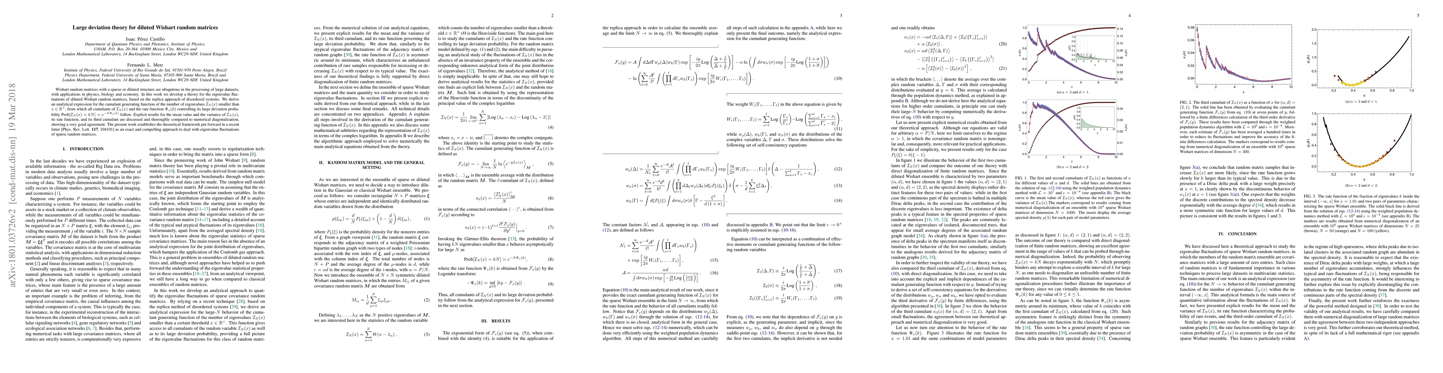 Researchers developed a theory for eigenvalue fluctuations of diluted Wishart random matrices using the replica approach, providing an analytical expression for cumulant generating functions and rate functions that control large deviation probabilities.