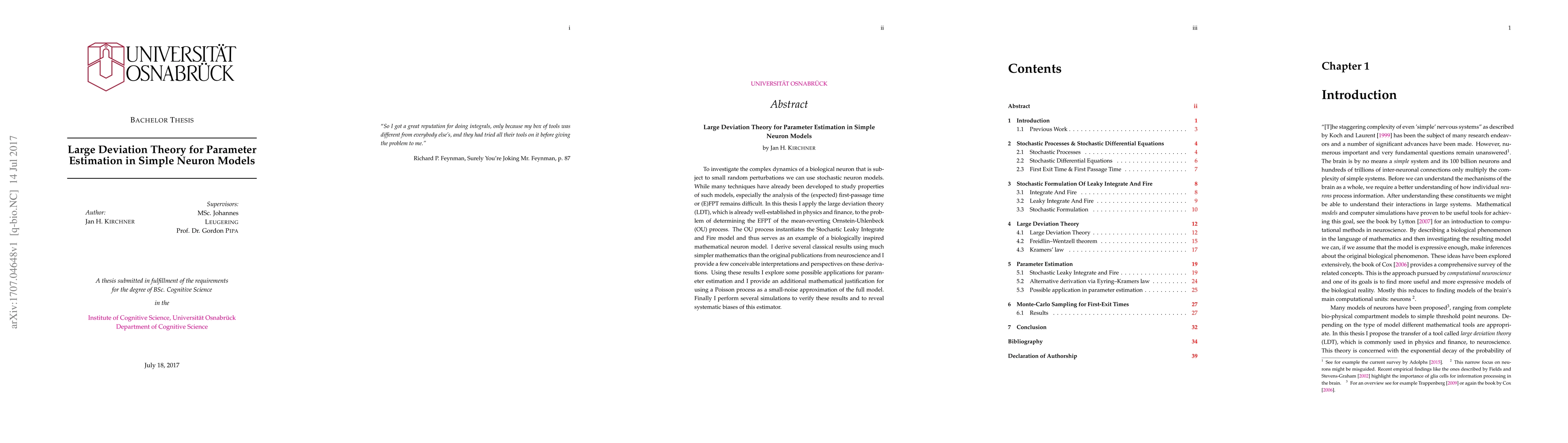 To investigate the complex dynamics of a biological neuron that is subject to small random perturbations we can use stochastic neuron models. While many techniques have already been developed to study properties of such models, especially the analysis of the (expected) first-passage time or (E)FPT remains difficult. In this thesis I apply the large deviation theory (LDT), which is already well-established in physics and finance, to the problem of determining the EFPT of the mean-reverting Ornstein-Uhlenbeck (OU) process. The OU process instantiates the Stochastic Leaky Integrate and Fire model and thus serves as an example of a biologically inspired mathematical neuron model. I derive several classical results using much simpler mathematics than the original publications from neuroscience and I provide a few conceivable interpretations and perspectives on these derivations. Using these results I explore some possible applications for parameter estimation and I provide an additional mathematical justification for using a Poisson process as a small-noise approximation of the full model. Finally I perform several simulations to verify these results and to reveal systematic biases of this estimator.