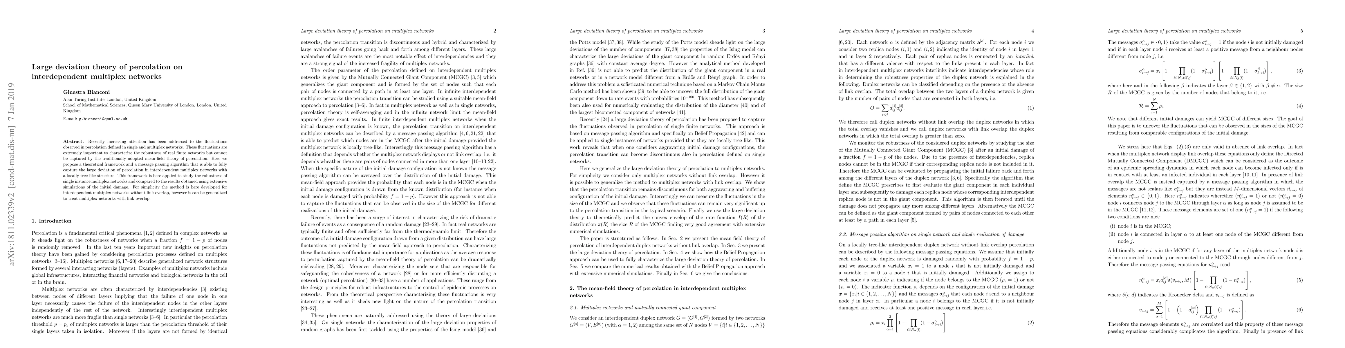 This paper proposes a theoretical framework and message passing algorithm to capture large deviation in percolation on multiplex networks, focusing on robustness. The method is applied to study single-instance multiplex networks and compared to simulation results.