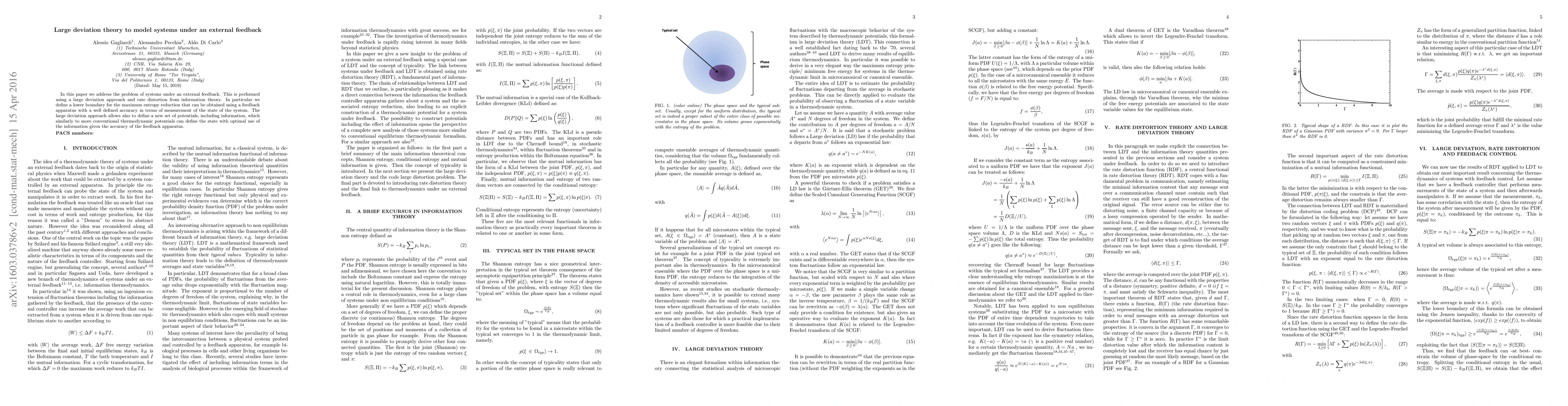 This paper uses large deviation theory to model systems under external feedback, introducing a new framework that links information theory to thermodynamic potentials. It provides a lower bound for maximum entropy reduction in systems with accurate measurement of the state.