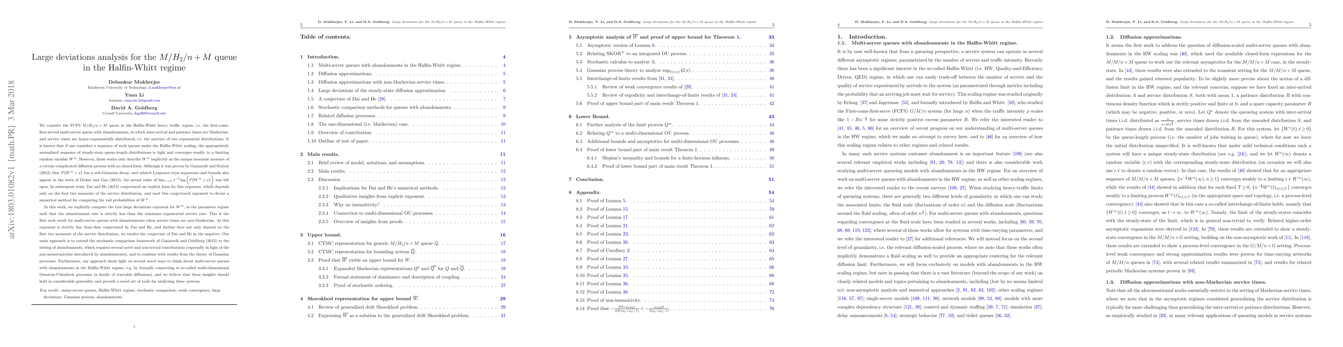 We consider the FCFS $M/H_2/n + M$ queue in the Halfin-Whitt heavy traffic regime. It is known that the normalized sequence of steady-state queue length distributions is tight and converges weakly to a limiting random variable W. However, those works only describe W implicitly as the invariant measure of a complicated diffusion. Although it was proven by Gamarnik and Stolyar that the tail of W is sub-Gaussian, the actual value of $\lim_{x \rightarrow \infty}x^{-2}\log(P(W >x))$ was left open. In subsequent work, Dai and He conjectured an explicit form for this exponent, which was insensitive to the higher moments of the service distribution. We explicitly compute the true large deviations exponent for W when the abandonment rate is less than the minimum service rate, the first such result for non-Markovian queues with abandonments. Interestingly, our results resolve the conjecture of Dai and He in the negative. Our main approach is to extend the stochastic comparison framework of Gamarnik and Goldberg to the setting of abandonments, requiring several novel and non-trivial contributions. Our approach sheds light on several novel ways to think about multi-server queues with abandonments in the Halfin-Whitt regime, which should hold in considerable generality and provide new tools for analyzing these systems.