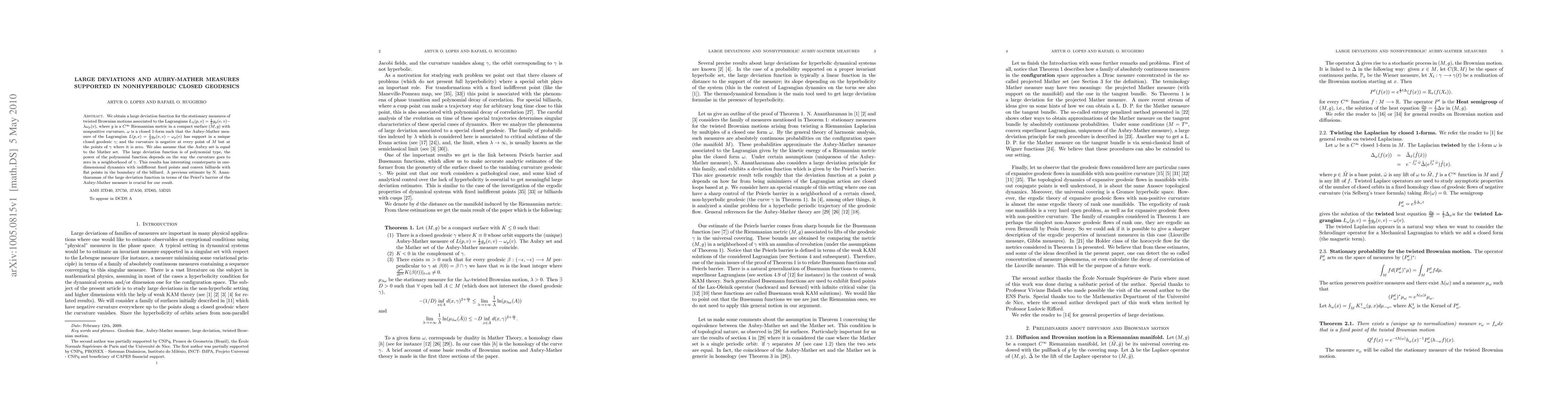 Researchers found a large deviation function for stationary measures of twisted Brownian motions associated with specific Lagrangians on compact surfaces with nonpositive curvature, supporting the existence of Aubry-Mather measures on unique closed geodesics.