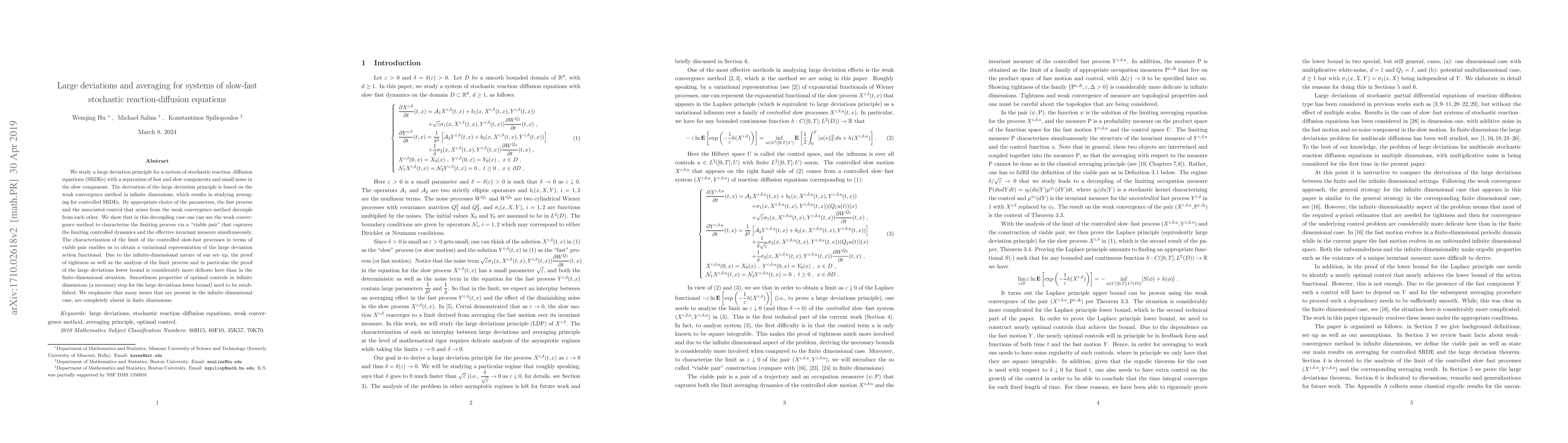 We study a large deviation principle for a system of stochastic reaction--diffusion equations (SRDEs) with a separation of fast and slow components and small noise in the slow component. The derivation of the large deviation principle is based on the weak convergence method in infinite dimensions, which results in studying averaging for controlled SRDEs. By appropriate choice of the parameters, the fast process and the associated control that arises from the weak convergence method decouple from each other. We show that in this decoupling case one can use the weak convergence method to characterize the limiting process via a "viable pair" that captures the limiting controlled dynamics and the effective invariant measure simultaneously. The characterization of the limit of the controlled slow-fast processes in terms of viable pair enables us to obtain a variational representation of the large deviation action functional. Due to the infinite--dimensional nature of our set--up, the proof of tightness as well as the analysis of the limit process and in particular the proof of the large deviations lower bound is considerably more delicate here than in the finite--dimensional situation. Smoothness properties of optimal controls in infinite dimensions (a necessary step for the large deviations lower bound) need to be established. We emphasize that many issues that are present in the infinite dimensional case, are completely absent in finite dimensions.