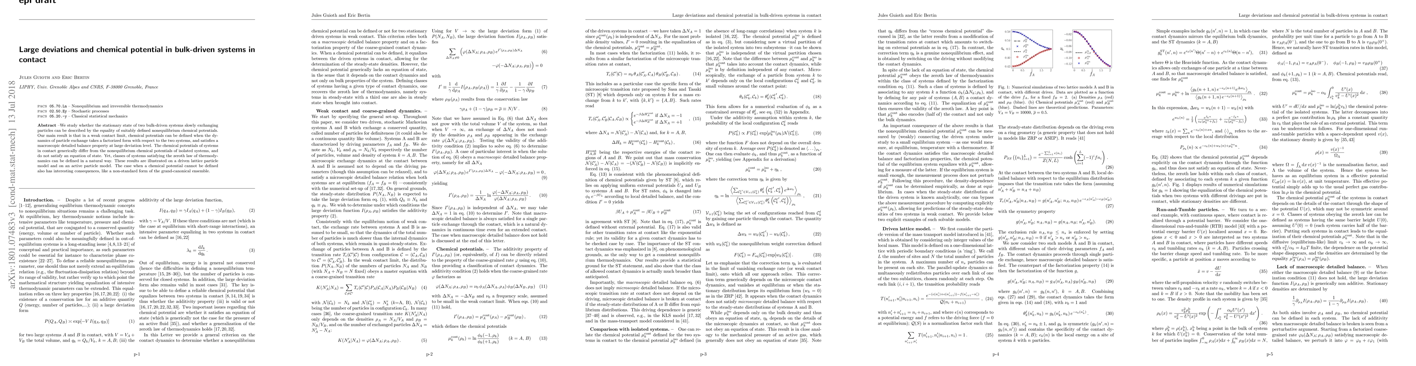 We study whether the stationary state of two bulk-driven systems slowly exchanging particles can be described by the equality of suitably defined nonequilibrium chemical potentials. Our main result is that in a weak contact limit, chemical potentials can be defined when the dynamics of particle exchange takes a factorized form with respect to the two systems, and satisfies a macroscopic detailed balance property at large deviation level. The chemical potentials of systems in contact generically differ from the nonequilibrium chemical potentials of isolated systems, and do not satisfy an equation of state. Yet, classes of systems satisfying the zeroth law of thermodynamics can be defined in a natural way. These results are illustrated on a driven lattice particle model and on an active particle model. The case when a chemical potential cannot be defined also has interesting consequences, like a non-standard form of the grand-canonical ensemble.