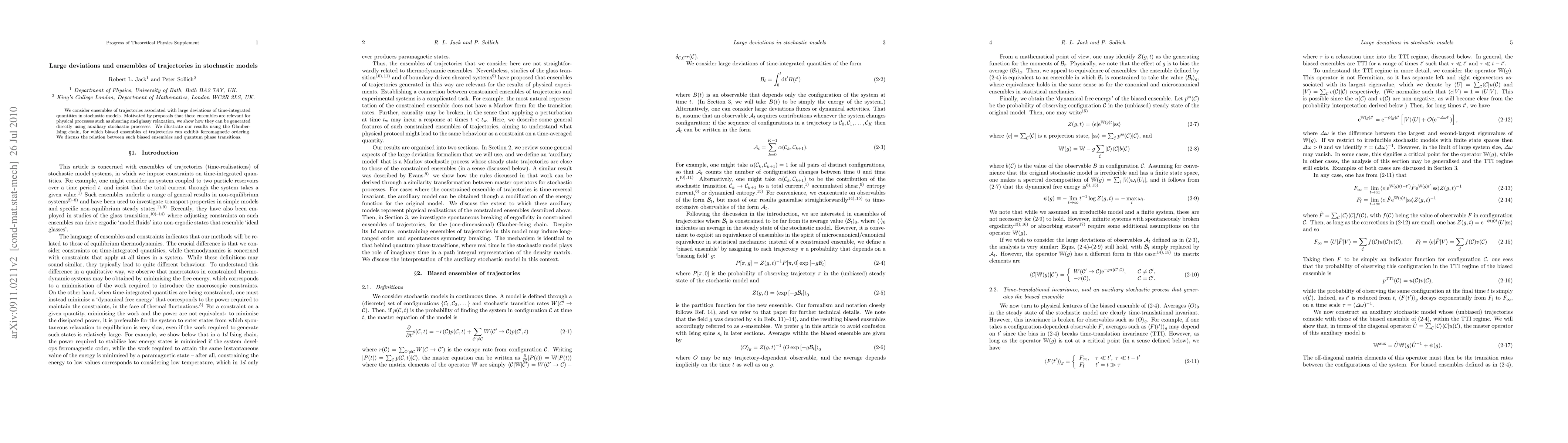 This paper explores ensembles of trajectories linked to large deviations in stochastic models, demonstrating their generation via auxiliary processes and relevance to physical processes like shearing and glassy relaxation. The study uses the Glauber-Ising chain to illustrate ferromagnetic ordering in biased ensembles and discusses their connection to quantum phase transitions.