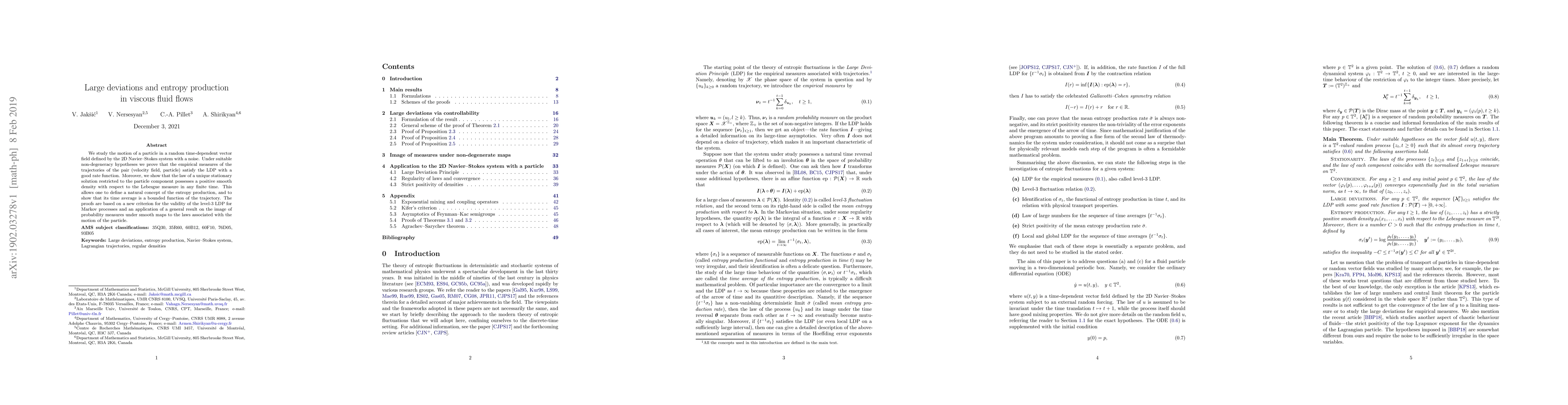 We study the motion of a particle in a random time-dependent vector field defined by the 2D Navier-Stokes system with a noise. Under suitable non-degeneracy hypotheses we prove that the empirical measures of the trajectories of the pair (velocity field, particle) satisfy the LDP with a good rate function. Moreover, we show that the law of a unique stationary solution restricted to the particle component possesses a positive smooth density with respect to the Lebesgue measure in any finite time. This allows one to define a natural concept of the entropy production, and to show that its time average is a bounded function of the trajectory. The proofs are based on a new criterion for the validity of the level-3 LDP for Markov processes and an application of a general result on the image of probability measures under smooth maps to the laws associated with the motion of the particle.