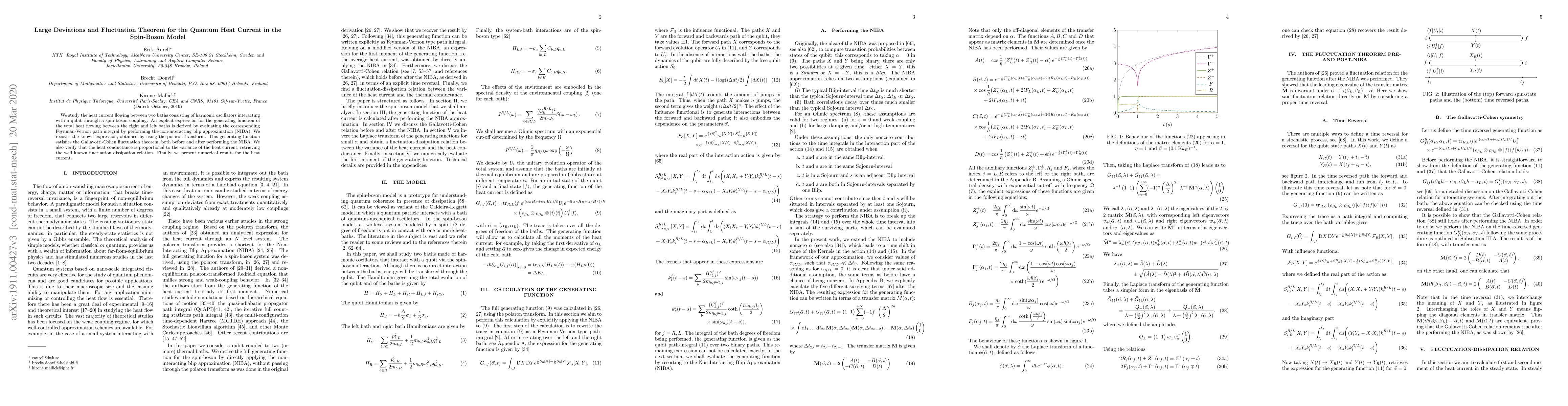 We study the heat current flowing between two baths consisting of harmonic oscillators interacting with a qubit through a spin-boson coupling. An explicit expression for the generating function of the total heat flowing between the hot and cold baths is derived by evaluating the corresponding Feynman-Vernon path integral under the non-interacting blip approximation (NIBA). This generating function satisfies the Gallavotti-Cohen fluctuation theorem, both before and after performing the NIBA. We also verify that the heat conductivity is proportional to the variance of the heat current, retrieving the well known fluctuation dissipation relation. Finally, we present numerical results for the heat current.