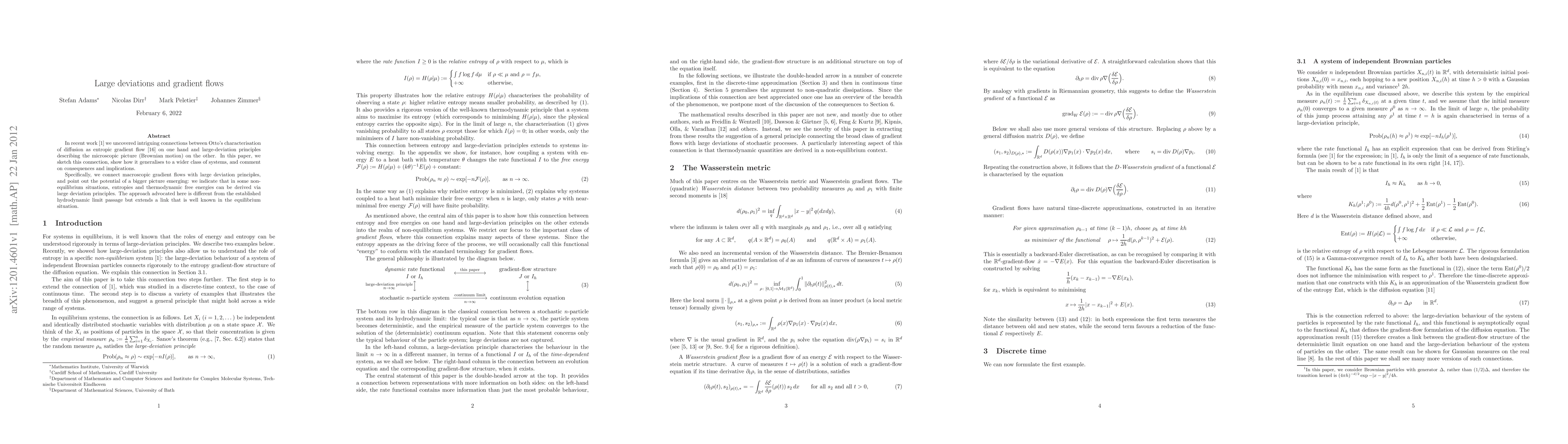 In recent work [1] we uncovered intriguing connections between Otto's characterisation of diffusion as entropic gradient flow [16] on one hand and large-deviation principles describing the microscopic picture (Brownian motion) on the other. In this paper, we sketch this connection, show how it generalises to a wider class of systems, and comment on consequences and implications. Specifically, we connect macroscopic gradient flows with large deviation principles, and point out the potential of a bigger picture emerging: we indicate that in some non- equilibrium situations, entropies and thermodynamic free energies can be derived via large deviation principles. The approach advocated here is different from the established hydrodynamic limit passage but extends a link that is well known in the equilibrium situation.