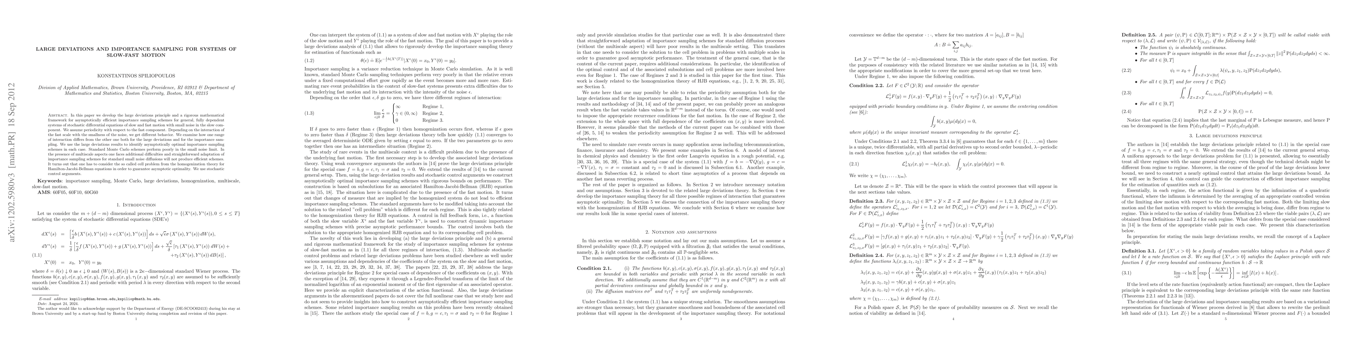 The paper develops a large deviations principle and a mathematical framework for efficient importance sampling in systems of slow-fast motion with small noise in the slow component, assuming periodicity with respect to the fast component.