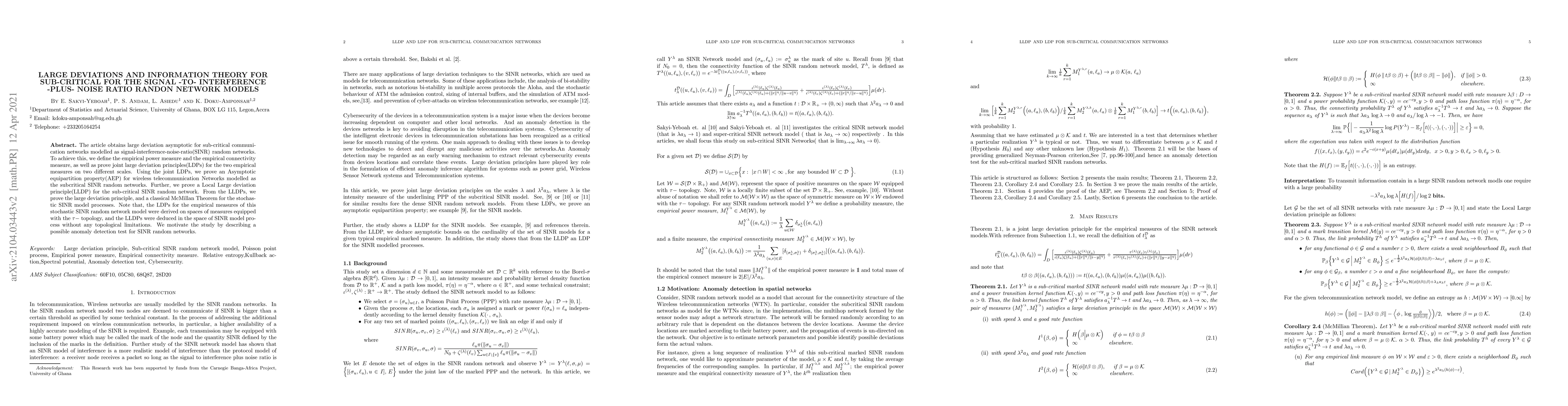 This paper explores large deviation principles for sub-critical SINR random network models, establishing joint LDPs for empirical power and connectivity measures. It also proves an Asymptotic Equipartition Property and a Local Large Deviation Principle for these networks, contributing to anomaly detection in wireless communication systems.
