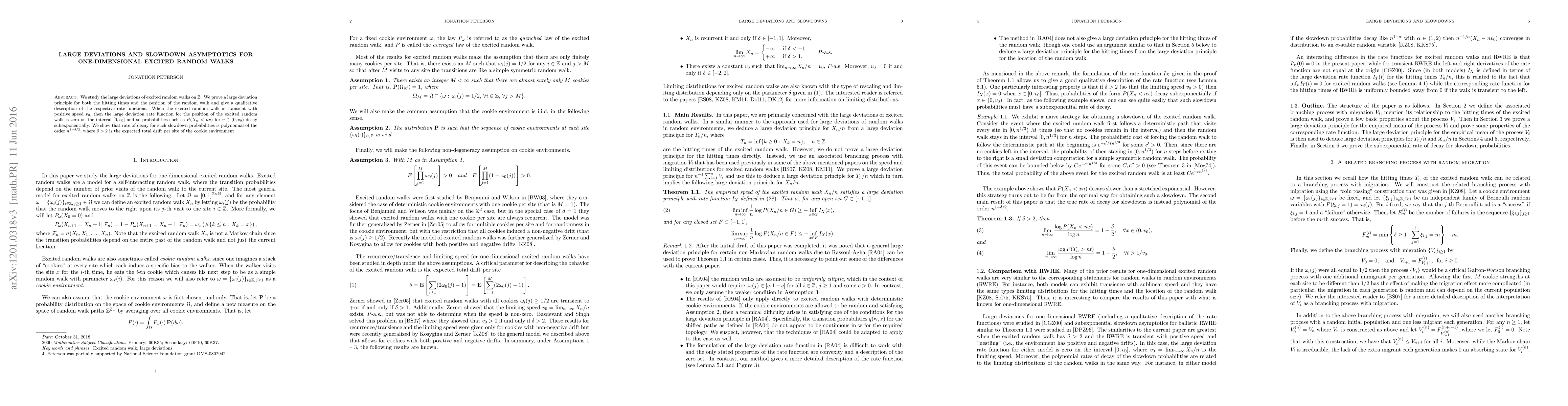 This paper investigates large deviations in one-dimensional excited random walks, proving a large deviation principle for hitting times and positions. It finds that when the walk is transient, probabilities of slow progress decay subexponentially with a polynomial rate dependent on the expected drift.