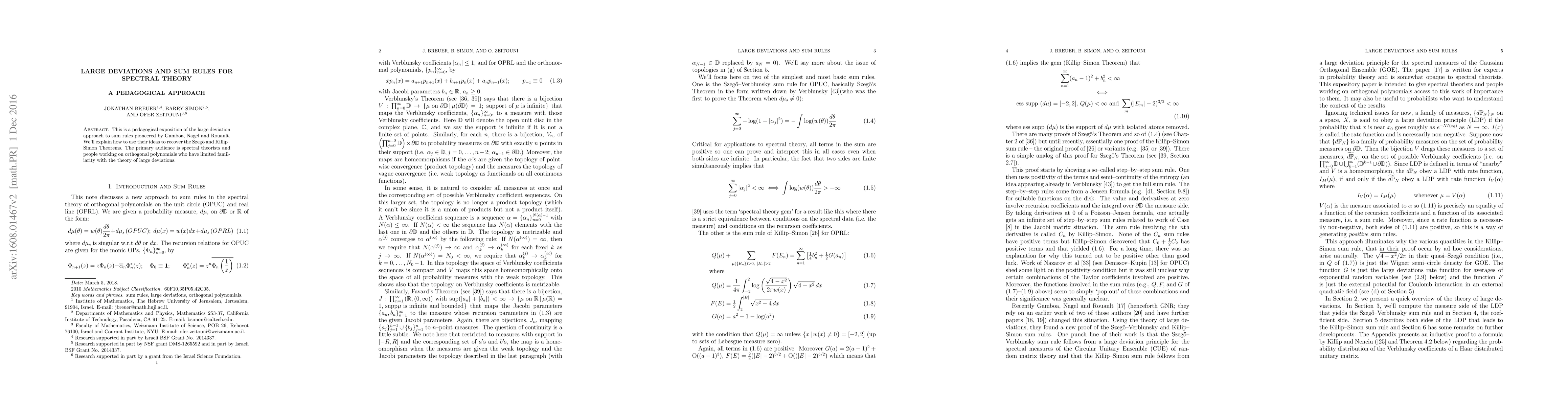 This is a pedagogical exposition of the large deviation approach to sum rules pioneered by Gamboa, Nagel and Rouault. We'll explain how to use their ideas to recover the Szeg}o and Killip{ Simon Theorems. The primary audience is spectral theorists and people working on orthogonal polynomials who have limited familiarity with the theory of large deviations.