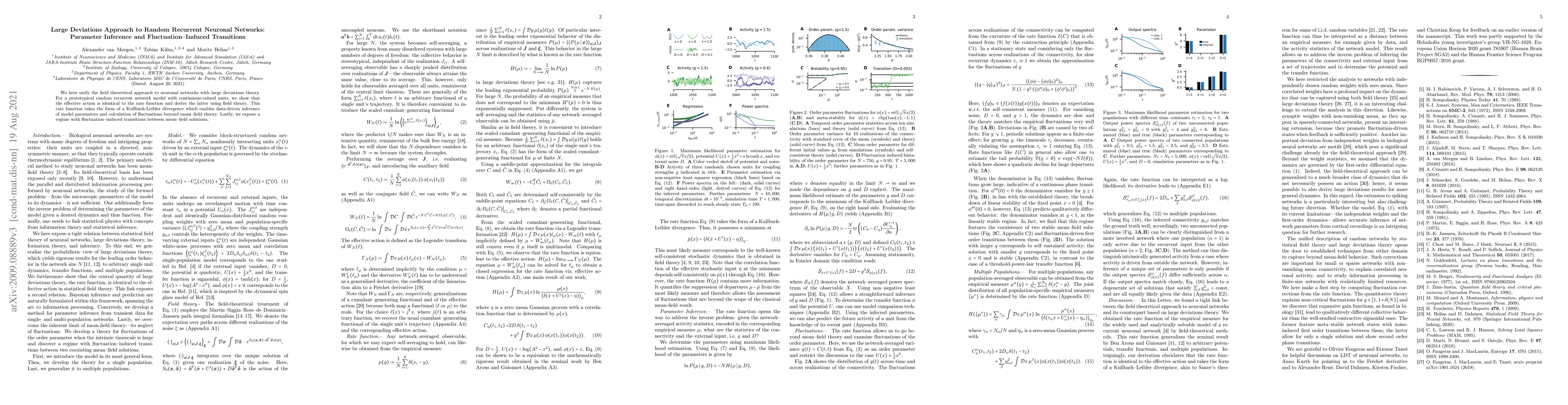 Researchers applied large deviations theory to model random recurrent neuronal networks, finding that a rate function derived from field theory can be used for data-driven parameter inference and calculation of fluctuations, revealing fluctuation-induced transitions between mean-field solutions.