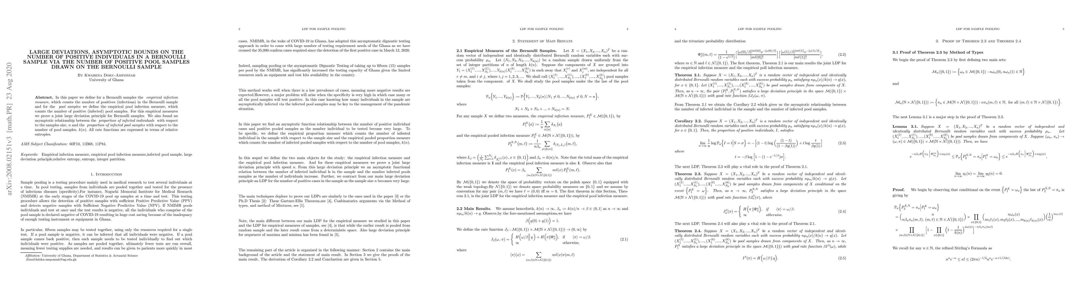 Researchers found a joint large deviation principle for Bernoulli samples and an asymptotic relationship between the proportion of infected individuals in samples and pool samples, using relative entropies to express rate functions.