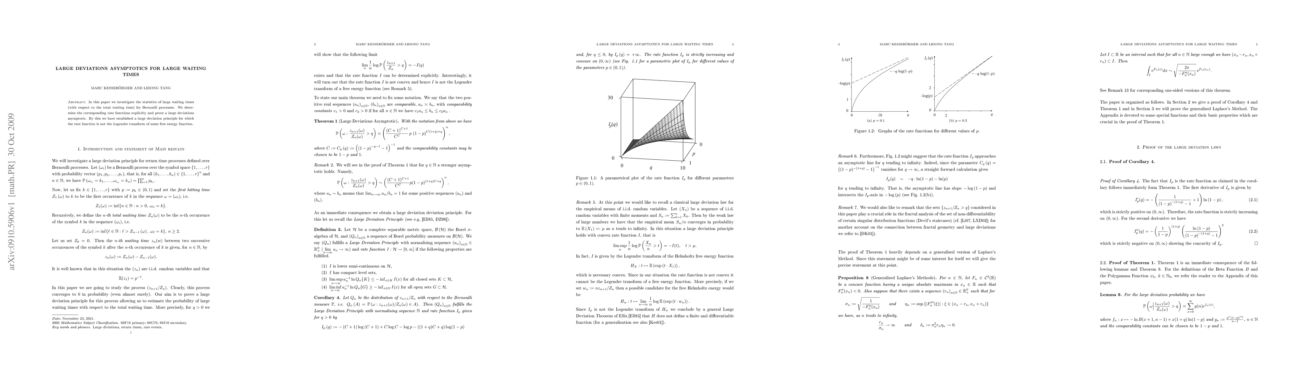 This paper examines the statistical behavior of large waiting times in Bernoulli processes, deriving explicit rate functions and establishing a large deviations asymptotic, with a unique rate function not derived from a Legendre transform of a free energy function.