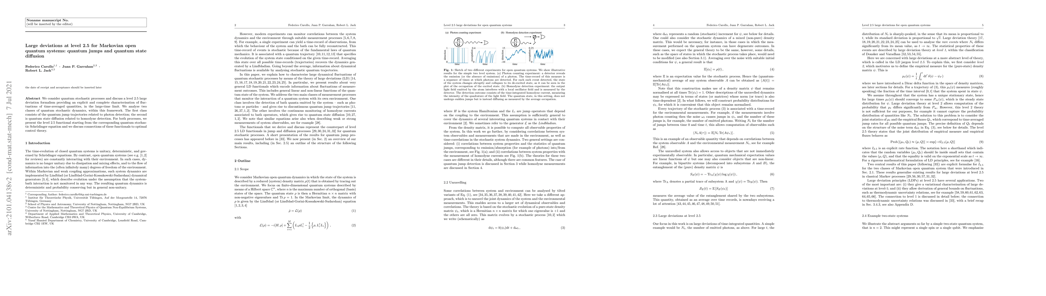 We consider quantum stochastic processes and discuss a level 2.5 large deviation formalism providing an explicit and complete characterisation of fluctuations of time-averaged quantities, in the large-time limit. We analyse two classes of quantum stochastic dynamics, within this framework. The first class consists of the quantum jump trajectories related to photon detection; the second is quantum state diffusion related to homodyne detection. For both processes, we present the level 2.5 functional starting from the corresponding quantum stochastic Schr\"odinger equation and we discuss connections of these functionals to optimal control theory.