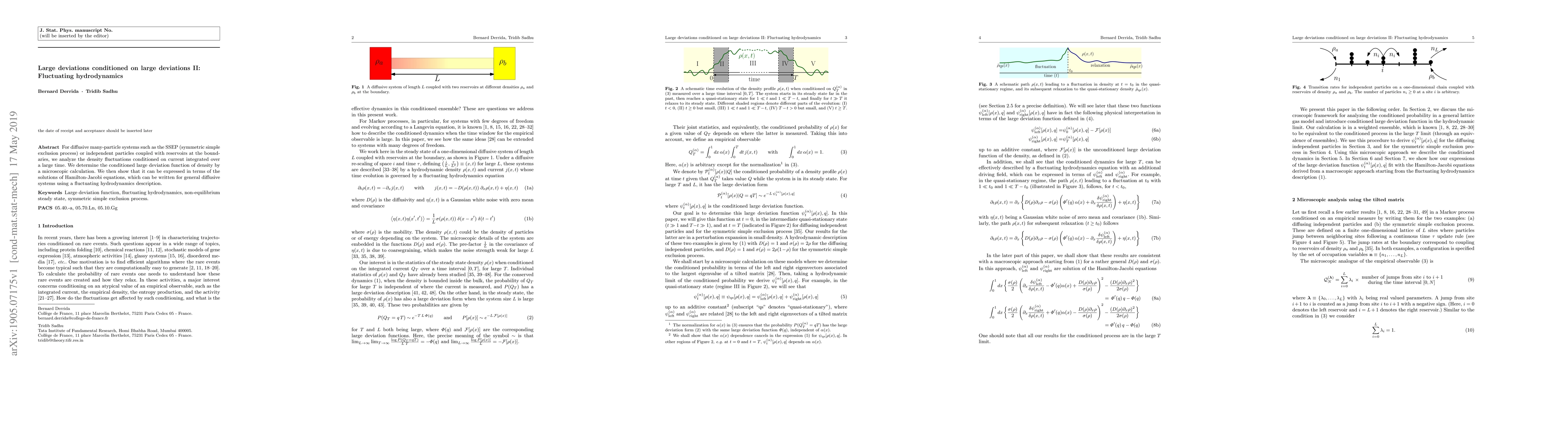 This research paper analyzes density fluctuations in diffusive many-particle systems using fluctuating hydrodynamics, showing that large deviation functions can be expressed through solutions to Hamilton-Jacobi equations.