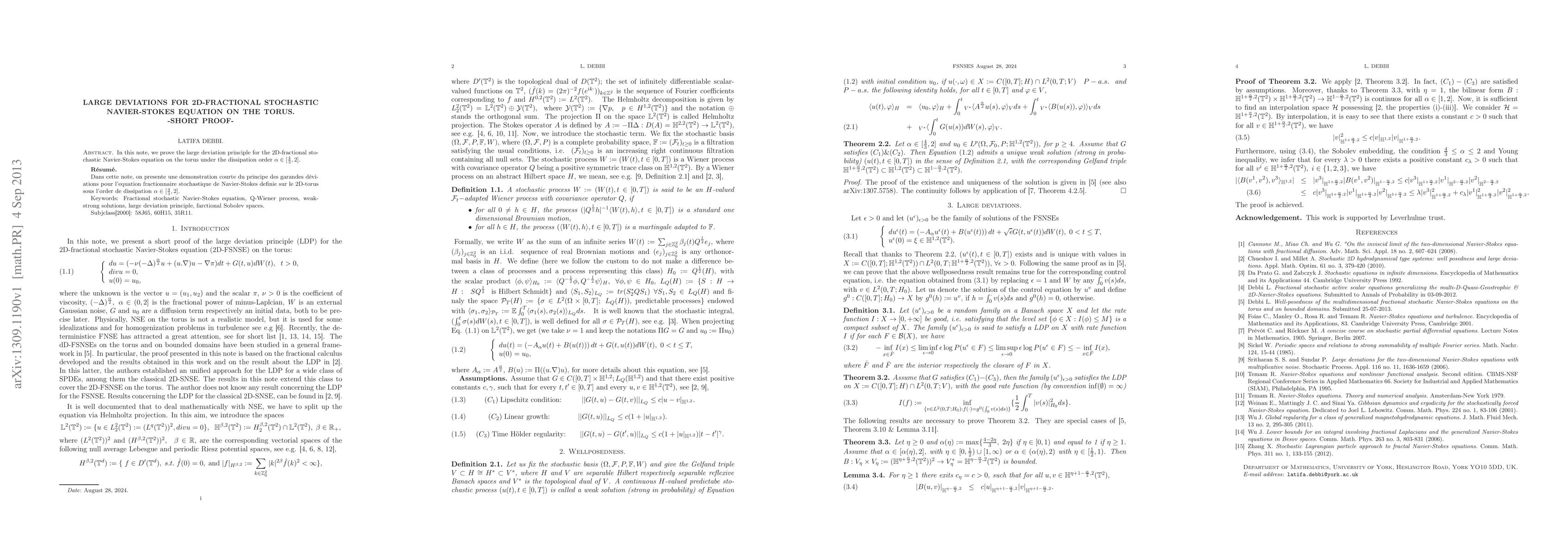 Summary: This paper establishes the large deviation principle for the 2D-fractional stochastic Navier-Stokes equation on the torus, focusing on dissipation orders within the range of $\alpha \in [\frac{4}{3}, 2]$. The proof is concise and rigorous.