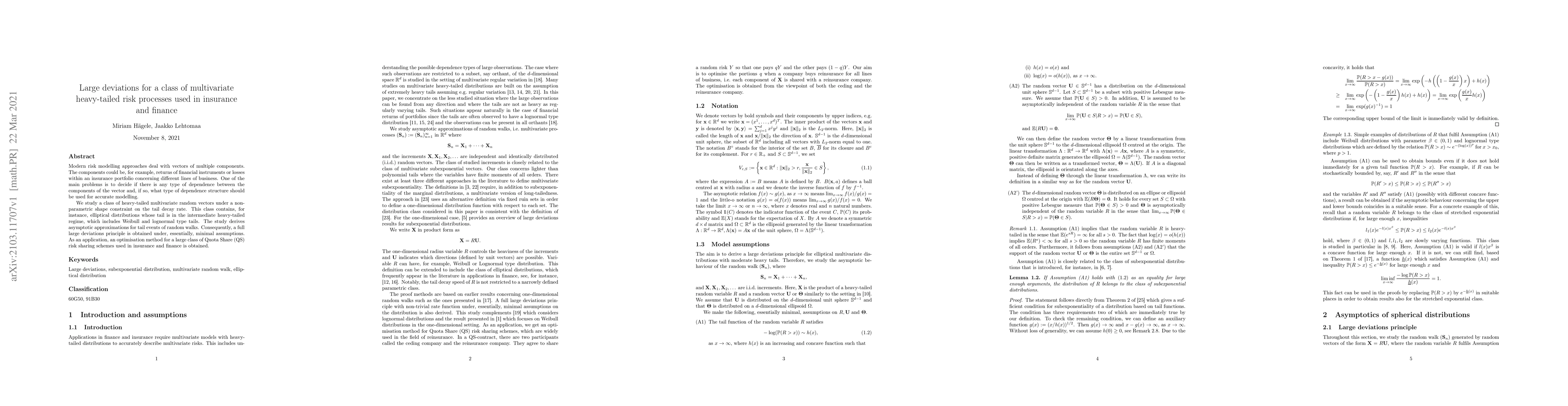 Modern risk modelling approaches deal with vectors of multiple components. The components could be, for example, returns of financial instruments or losses within an insurance portfolio concerning different lines of business. One of the main problems is to decide if there is any type of dependence between the components of the vector and, if so, what type of dependence structure should be used for accurate modelling. We study a class of heavy-tailed multivariate random vectors under a non-parametric shape constraint on the tail decay rate. This class contains, for instance, elliptical distributions whose tail is in the intermediate heavy-tailed regime, which includes Weibull and lognormal type tails. The study derives asymptotic approximations for tail events of random walks. Consequently, a full large deviations principle is obtained under, essentially, minimal assumptions. As an application, an optimisation method for a large class of Quota Share (QS) risk sharing schemes used in insurance and finance is obtained.