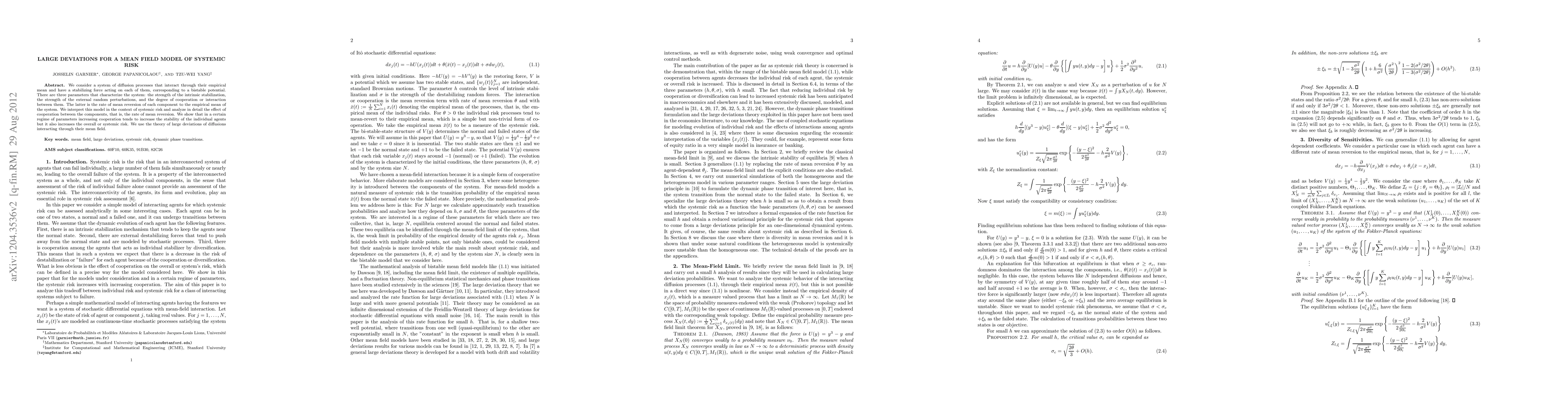 We consider a system of diffusion processes that interact through their empirical mean and have a stabilizing force acting on each of them, corresponding to a bistable potential. There are three parameters that characterize the system: the strength of the intrinsic stabilization, the strength of the external random perturbations, and the degree of cooperation or interaction between them. The latter is the rate of mean reversion of each component to the empirical mean of the system. We interpret this model in the context of systemic risk and analyze in detail the effect of cooperation between the components, that is, the rate of mean reversion. We show that in a certain regime of parameters increasing cooperation tends to increase the stability of the individual agents but it also increases the overall or systemic risk. We use the theory of large deviations of diffusions interacting through their mean field.