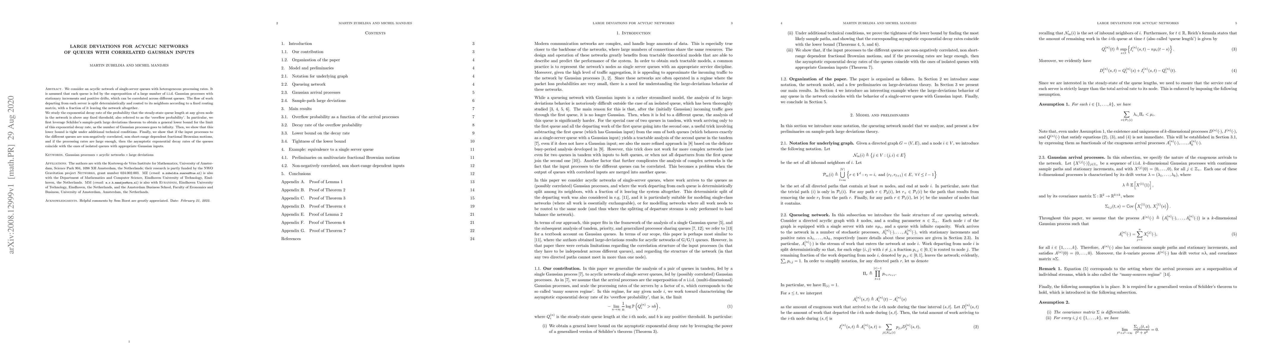 This paper investigates the large deviations behavior of acyclic queue networks with Gaussian inputs, deriving a lower bound for the exponential decay rate of overflow probabilities. It demonstrates that under specific conditions, the decay rates align with those of isolated queues with similar Gaussian inputs.