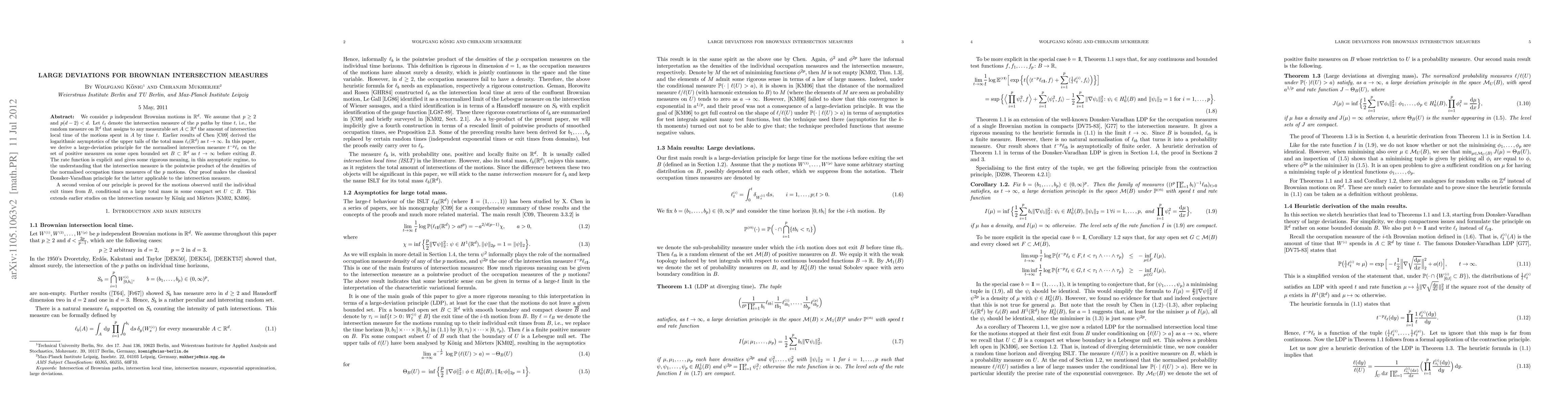 Researchers derive a large-deviation principle for Brownian intersection measures, showing that intersection time is the pointwise product of individual occupation times, and extend this to motions exiting a bounded set.
