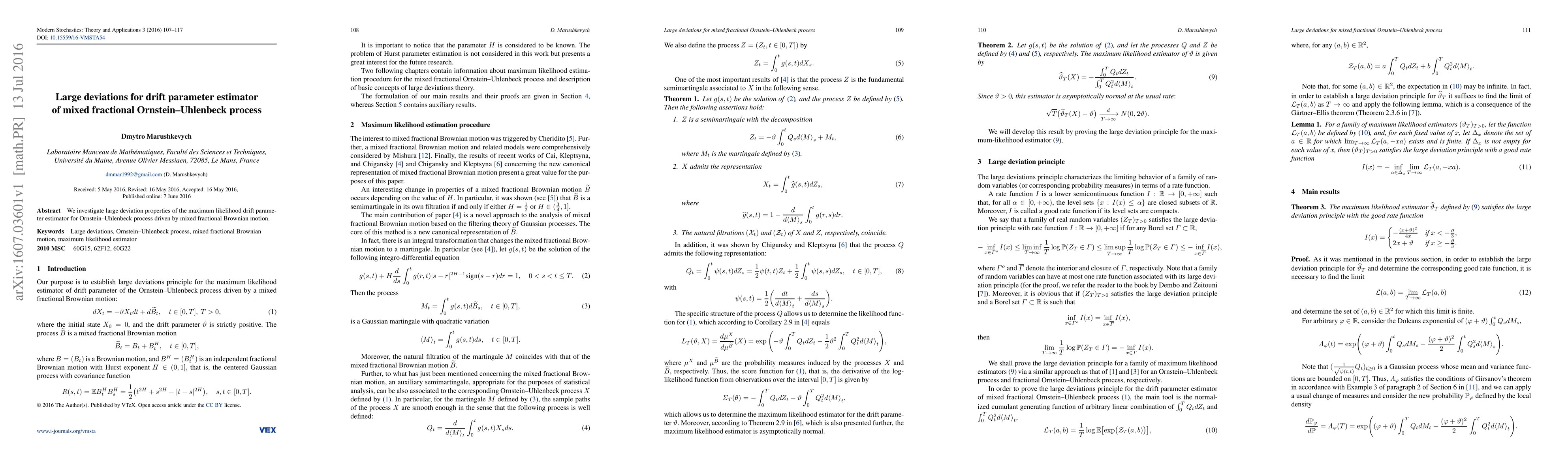 Summary: This study examines the large deviation behavior of the maximum likelihood estimator for the drift parameter in an Ornstein-Uhlenbeck process where the underlying noise is mixed fractional Brownian motion. The research focuses on understanding the asymptotic behavior and properties of the estimator.